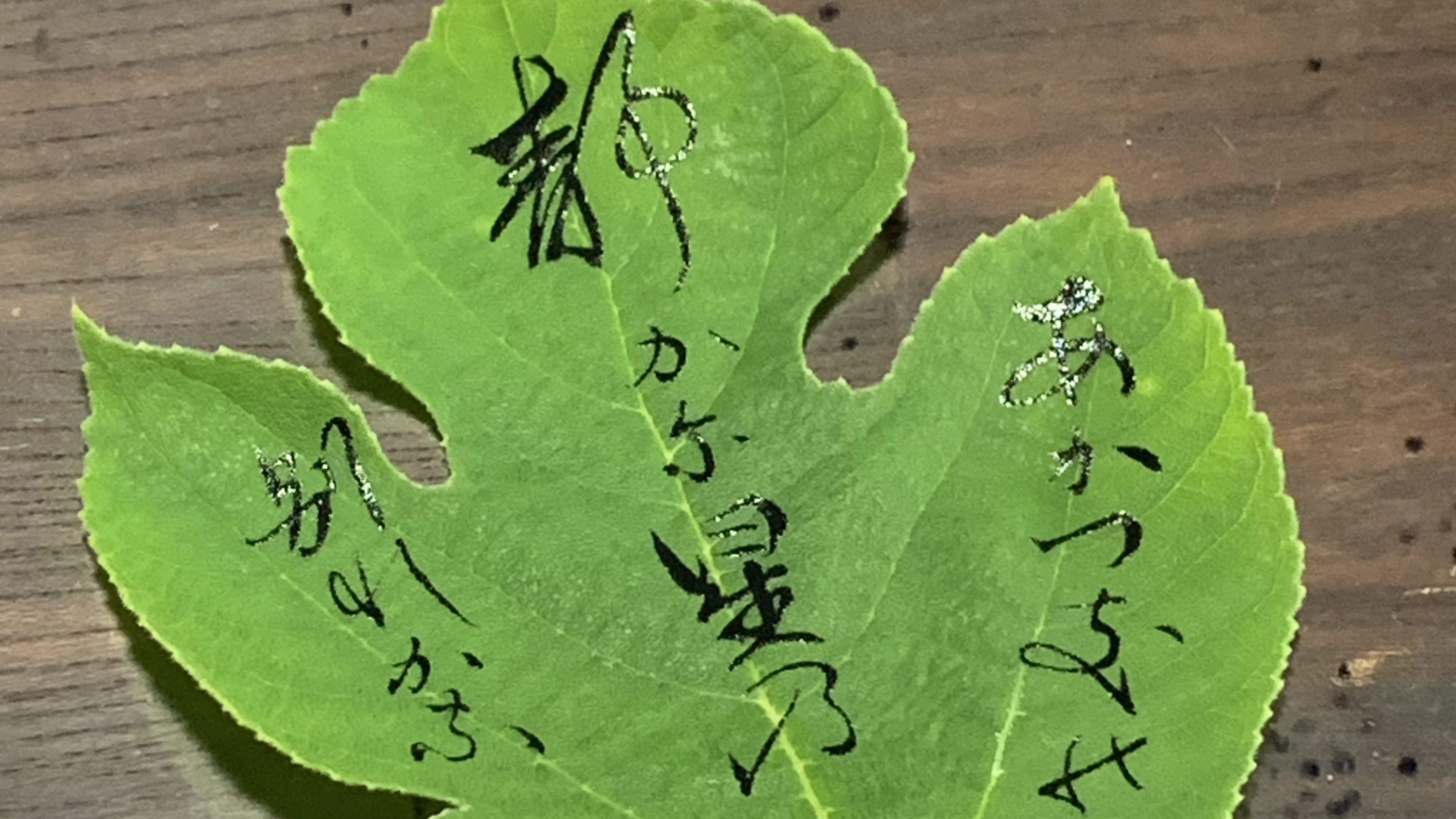 実は梶の葉には「墨がよく乗る」ことを教えてくださったのです。確かに葉の表面を撫でると細かな柔らかい毛が感じられ、なんとも気持ちがいい。これなら墨がうまく吸収されるだろうなと納得するような葉っぱです。それもそのはず、梶はクワ科コウゾ属。和紙に使われるコウゾの仲間と考えると合点がいきます。