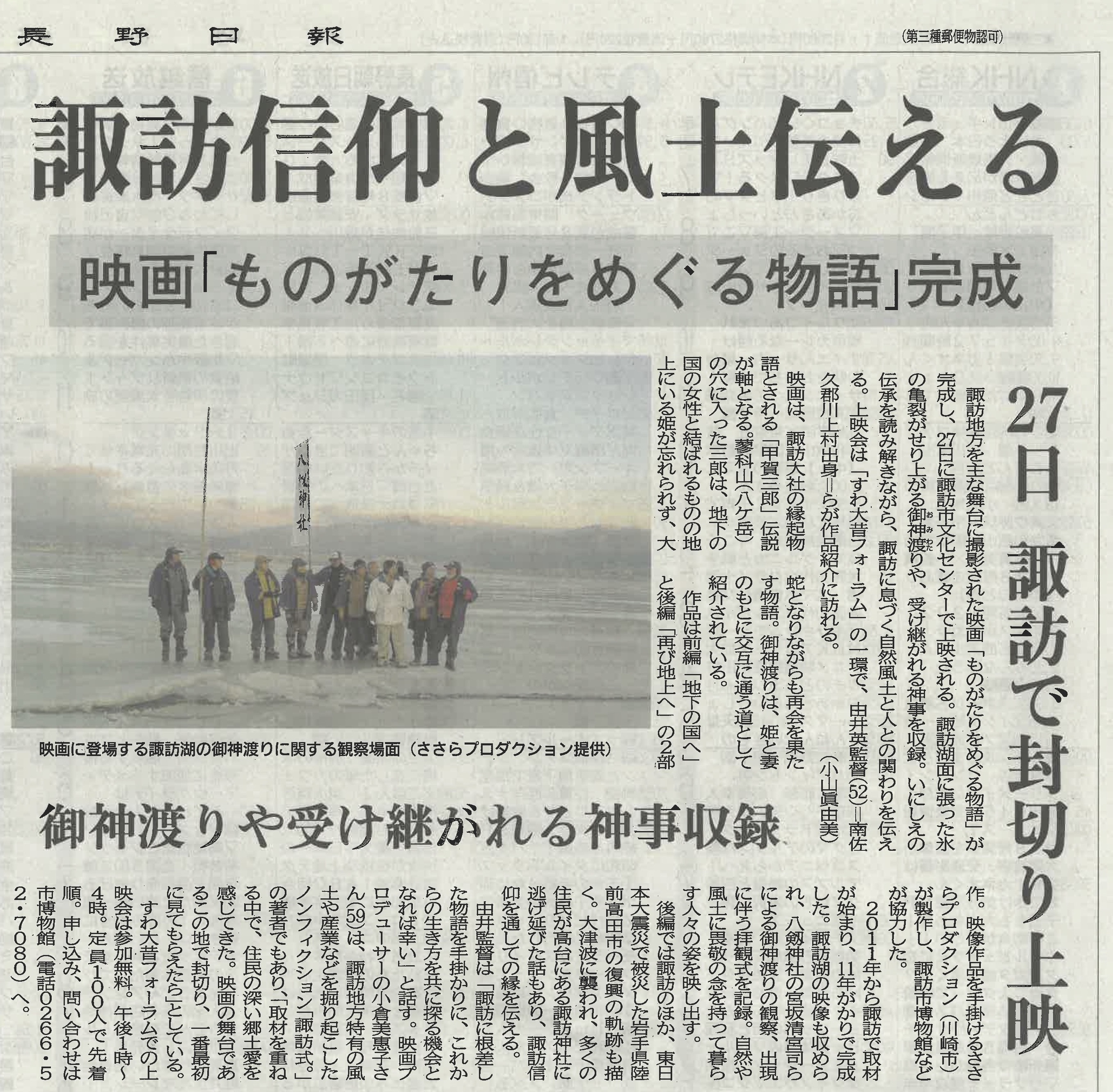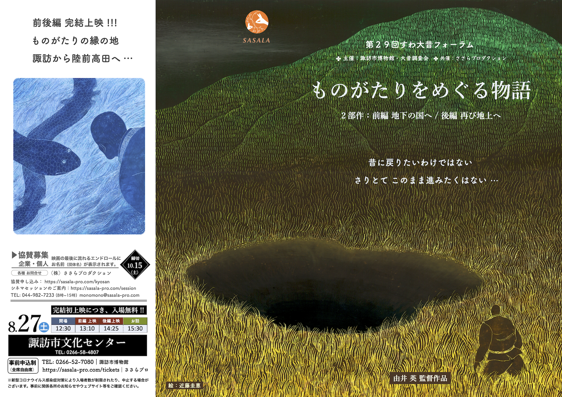 「ものがたりをめぐる物語」が映画のゆかりの地、諏訪市で上映されます。前後編(各61分)完結初公開映画会になります。入場無料ですが、事前申込制です。ささらのウェブサイトからはすでにお申し込みを開始しております。