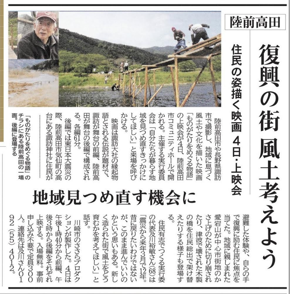 昨年の夏に後編も公開し、各地でご覧頂くようになりました。後編では、特に「板橋」のシーンが印象に残る様です。陸前高田市に流れる気仙川に地元の方々が手作りで橋をかけていく。その淡々とした作業がみなさんの記憶に残る様なのです。