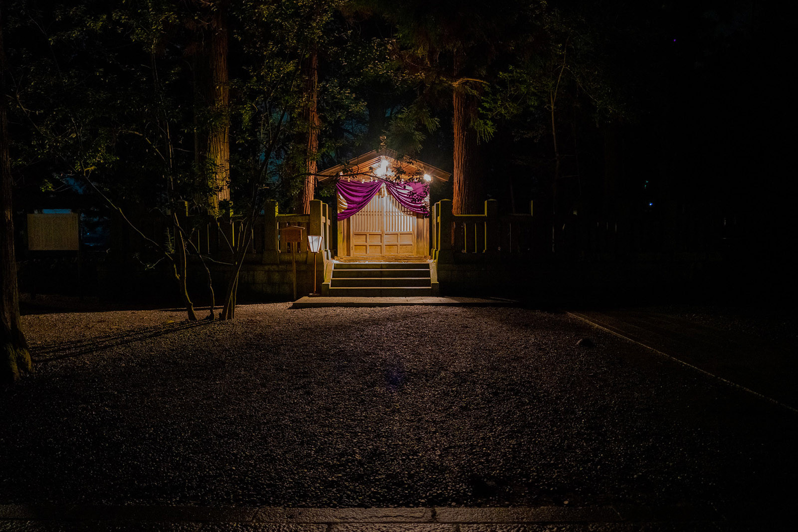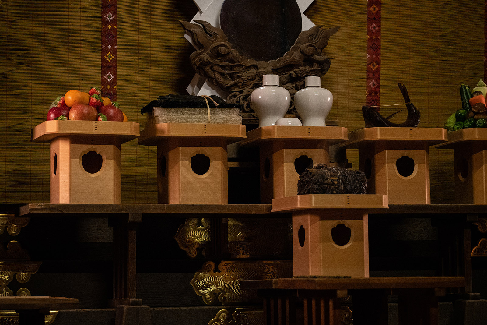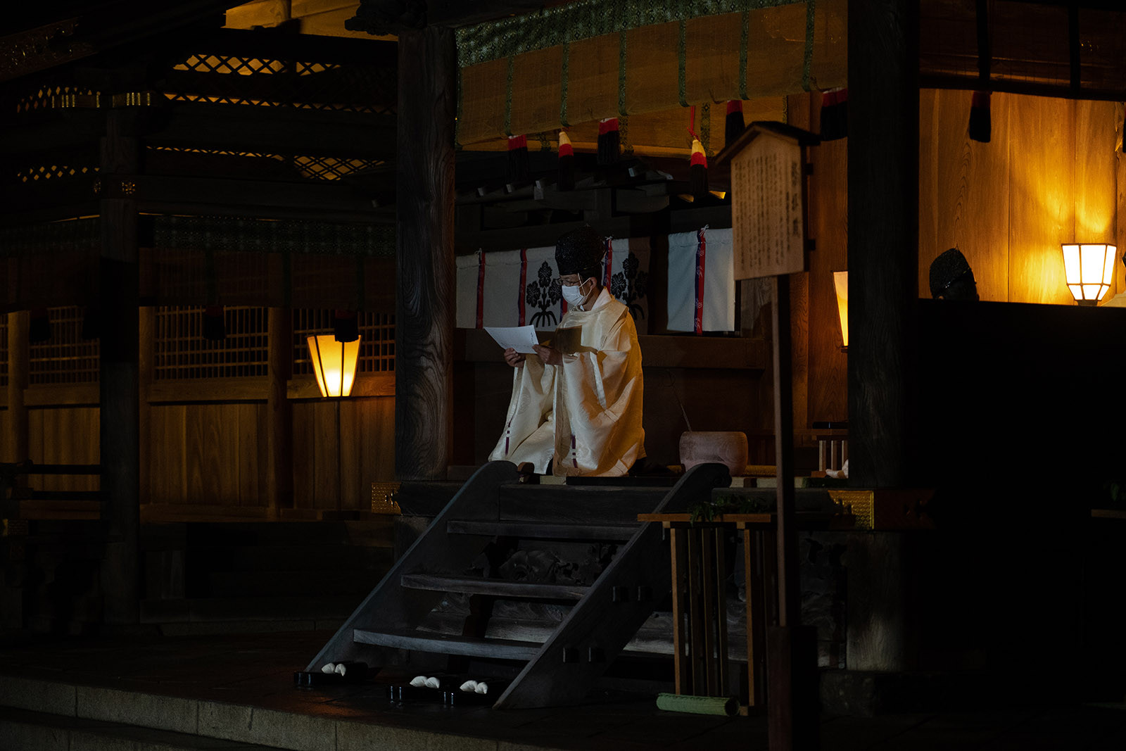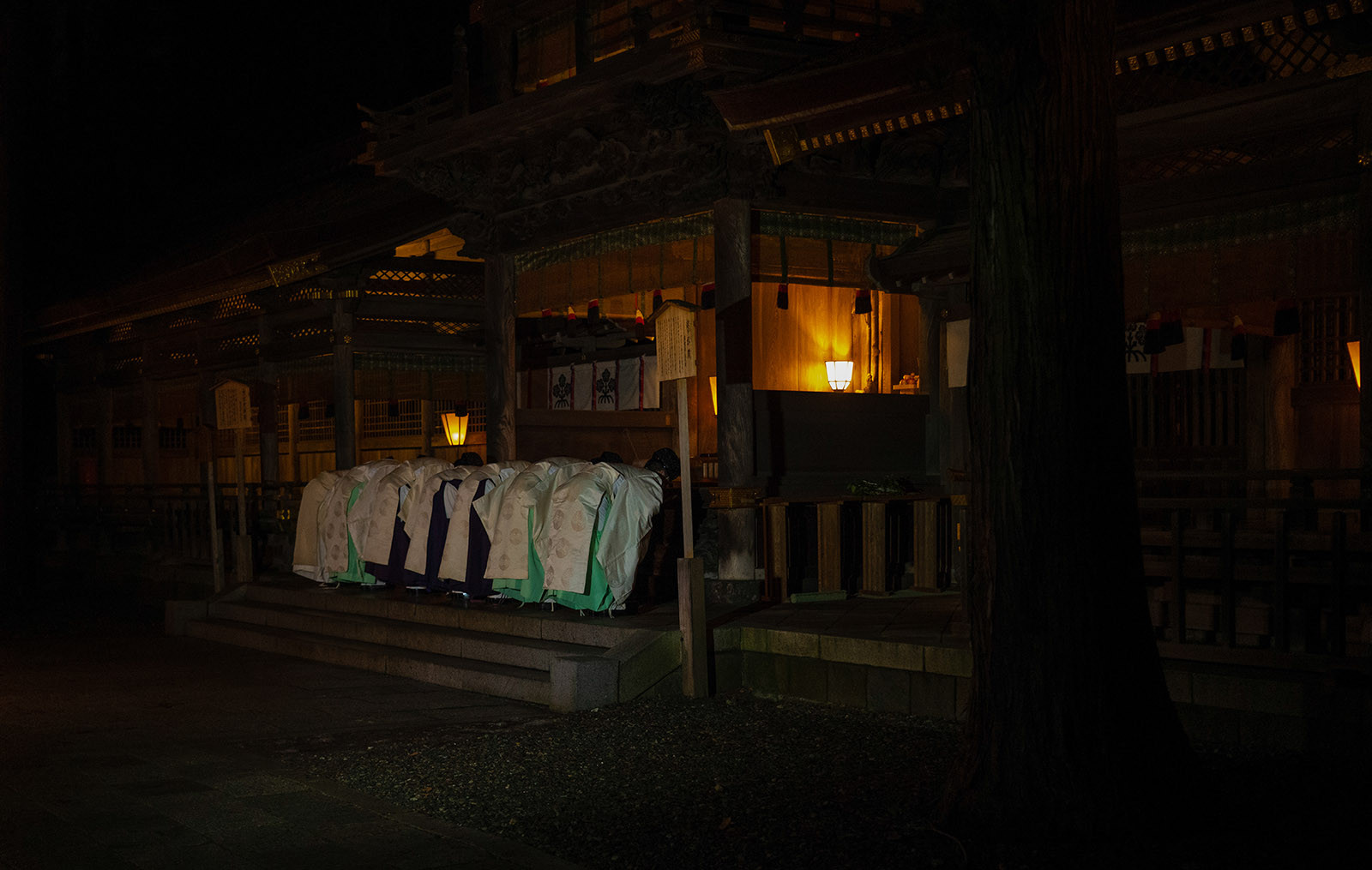 砥川のせせらぎの音が境内に響き渡る午前5時。前日から筒粥殿で煮込まれ続けていた葦束を取り上げ、神前に捧げ、宮司の見守る中、権宮司が葦筒を解き、取り上げ小豆の詰まり具合を判定します。葦束は44本あり、そのうち43本は「うぐいすな」・「桑」・「小麦」など穀物や野菜が決められており最後の1本は「世の中」の景気占いとなっているため、44本全てを判定するのに1時間くらい掛かるだろうか。その間すべての神職や集まった人々はじっとその様子を静かに見守っています。ここでも、砥川の水を流れる音が神楽や警蹕のようにこの場所のすべてを包み込んでいるように感じます。