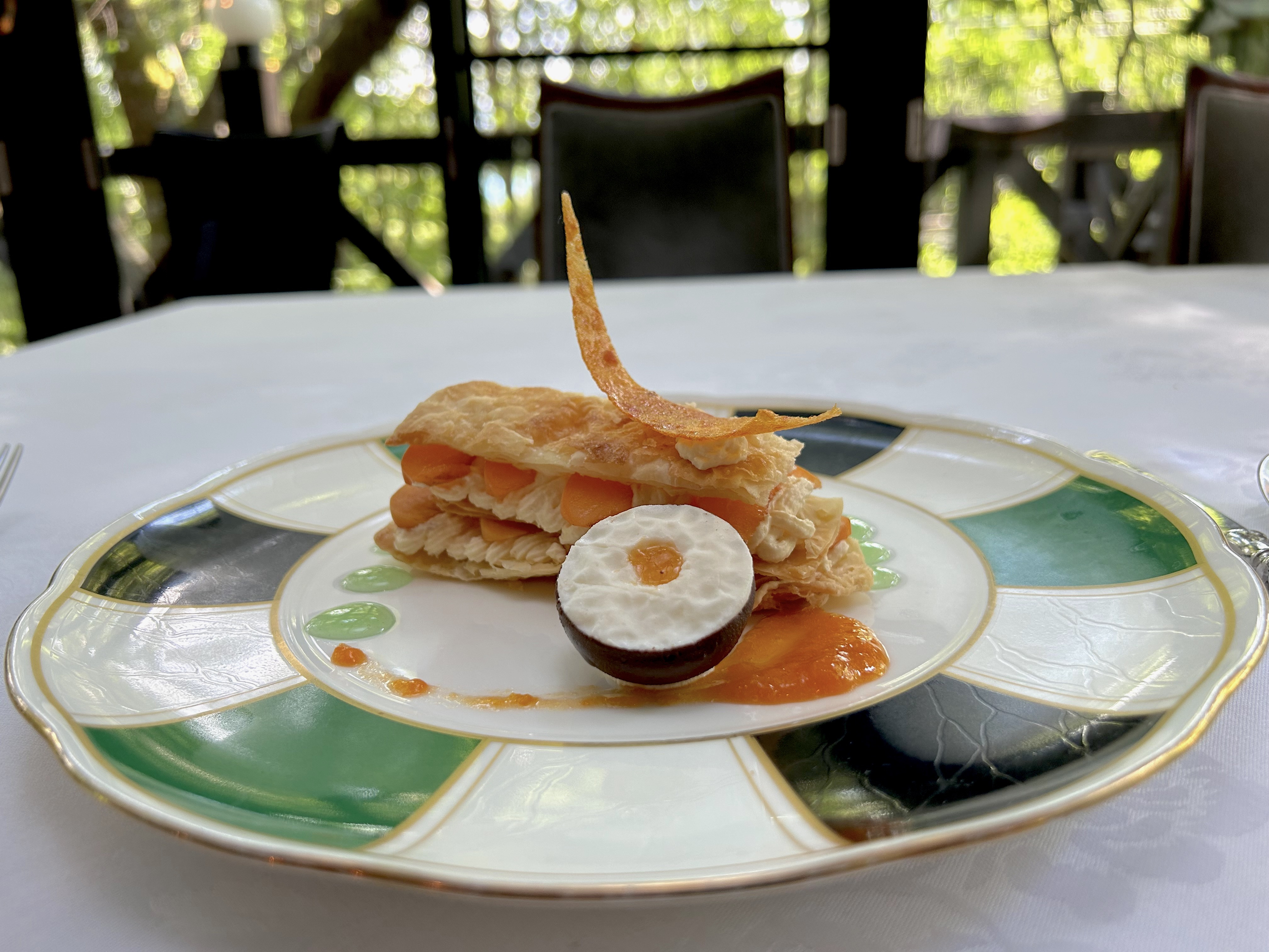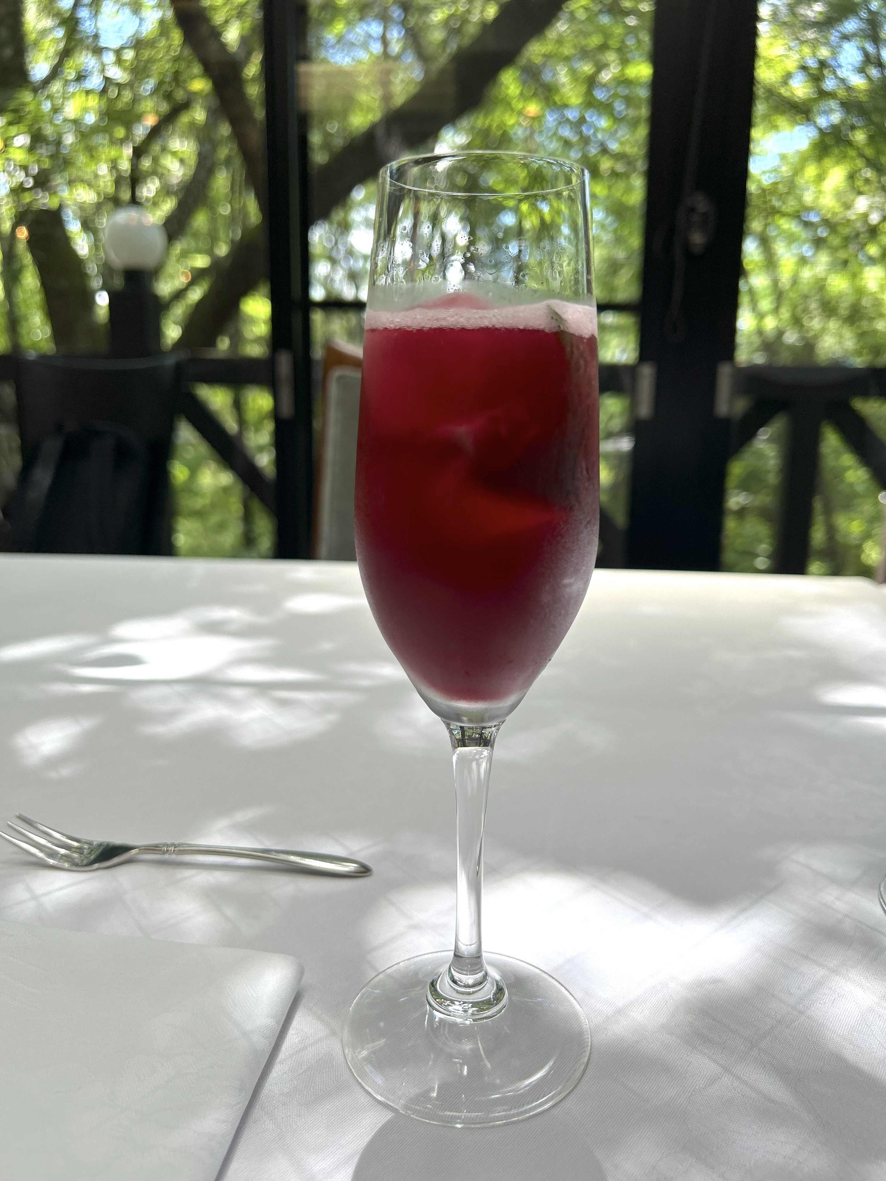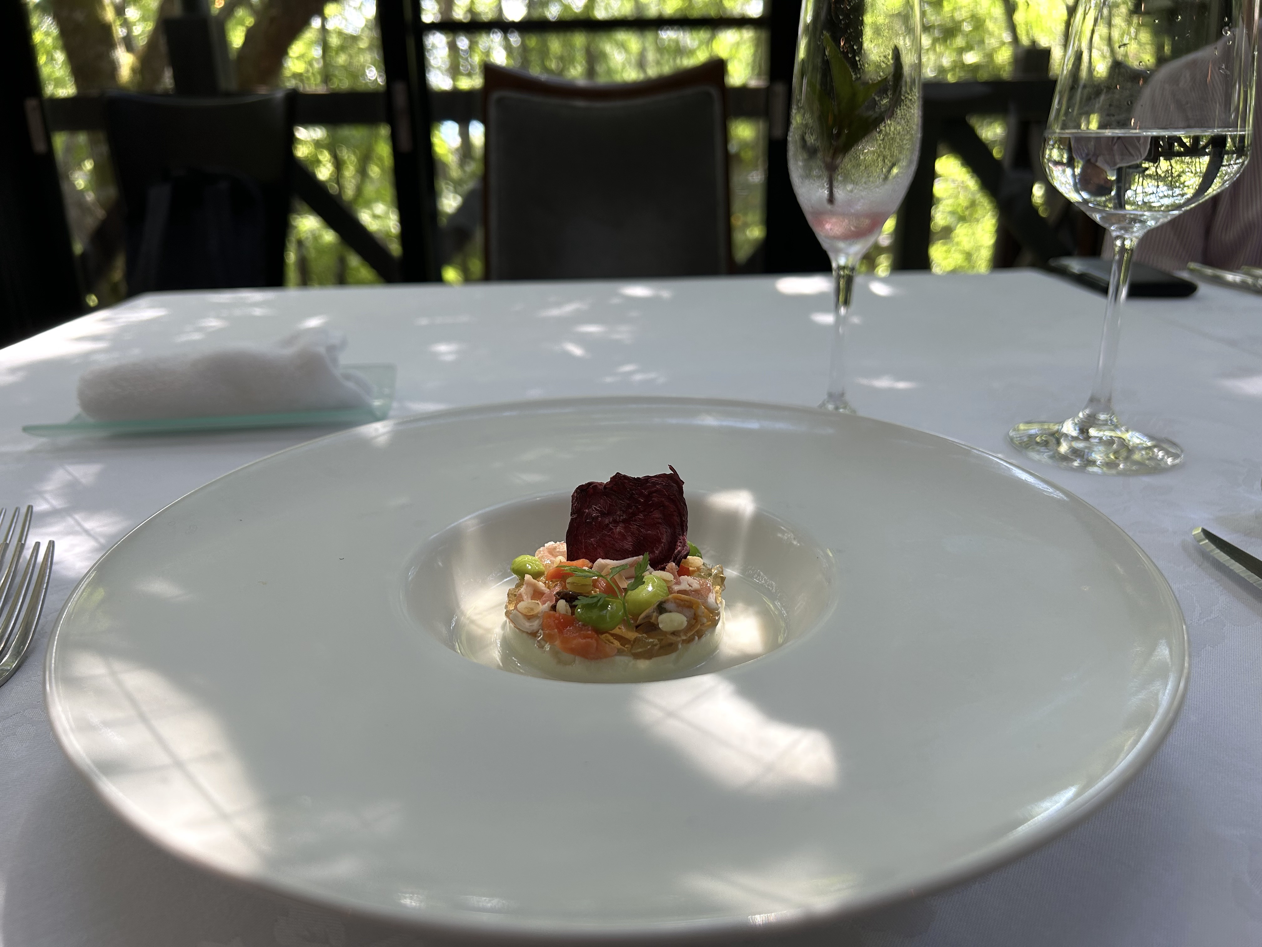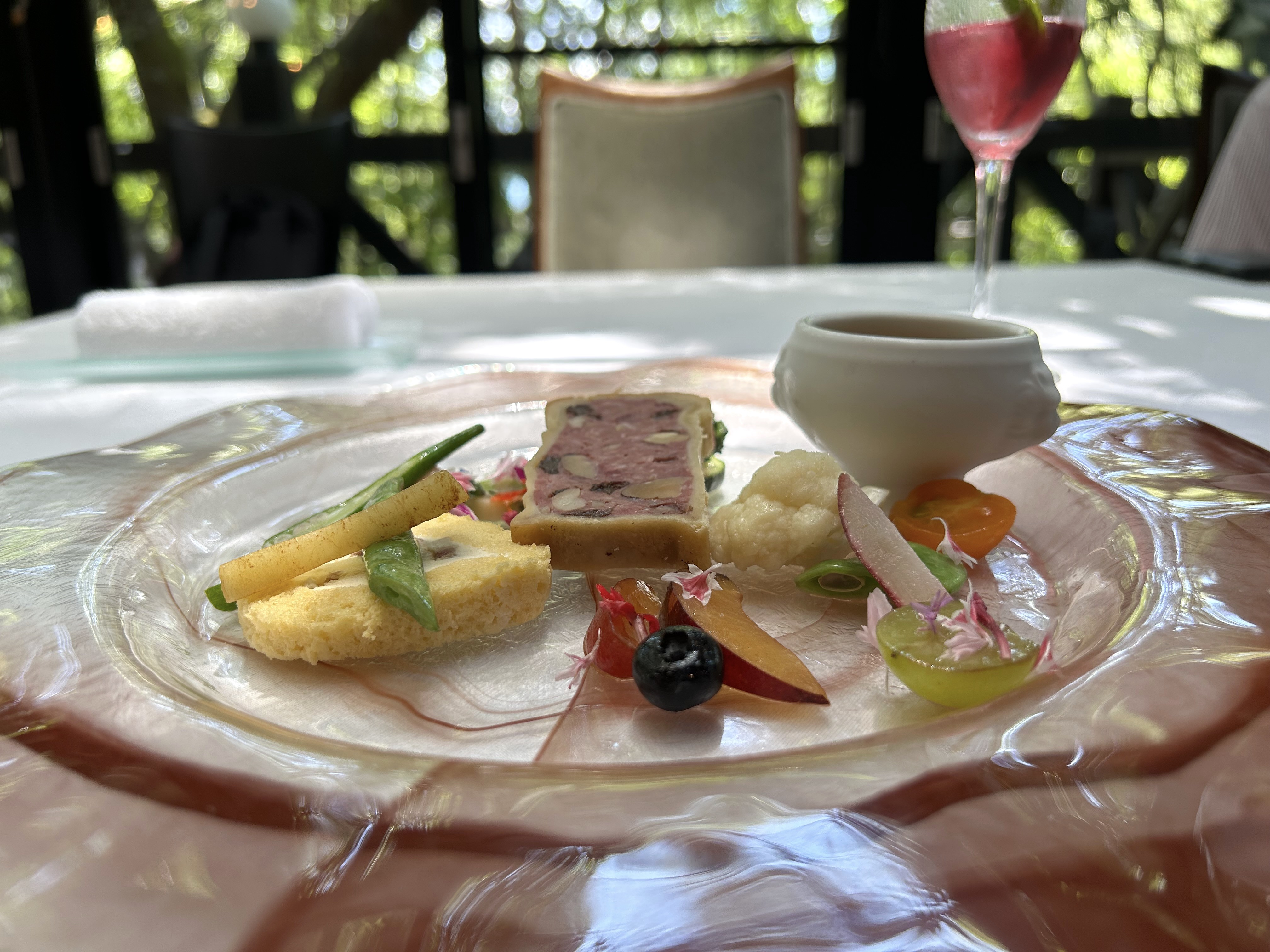 そして食事をするテーブル席へ案内される。やや低めの天井を抜けた奥には、ガラス張りの開放的な空間が広がっていた。全体的に涼しげな木陰に覆われていたが、幾重もの枝葉を通り抜けてきた優しい木漏れ日がまだら状に点在し、一つのテーブルを示していた。たくさんの小さな幾何学的な形の光が、まるで風が吹く動きに合わせて生き物のようにあっちへ行ったり、こっちへ行ったりしている。私たちが座るべきテーブルを案内してくれているようだった。