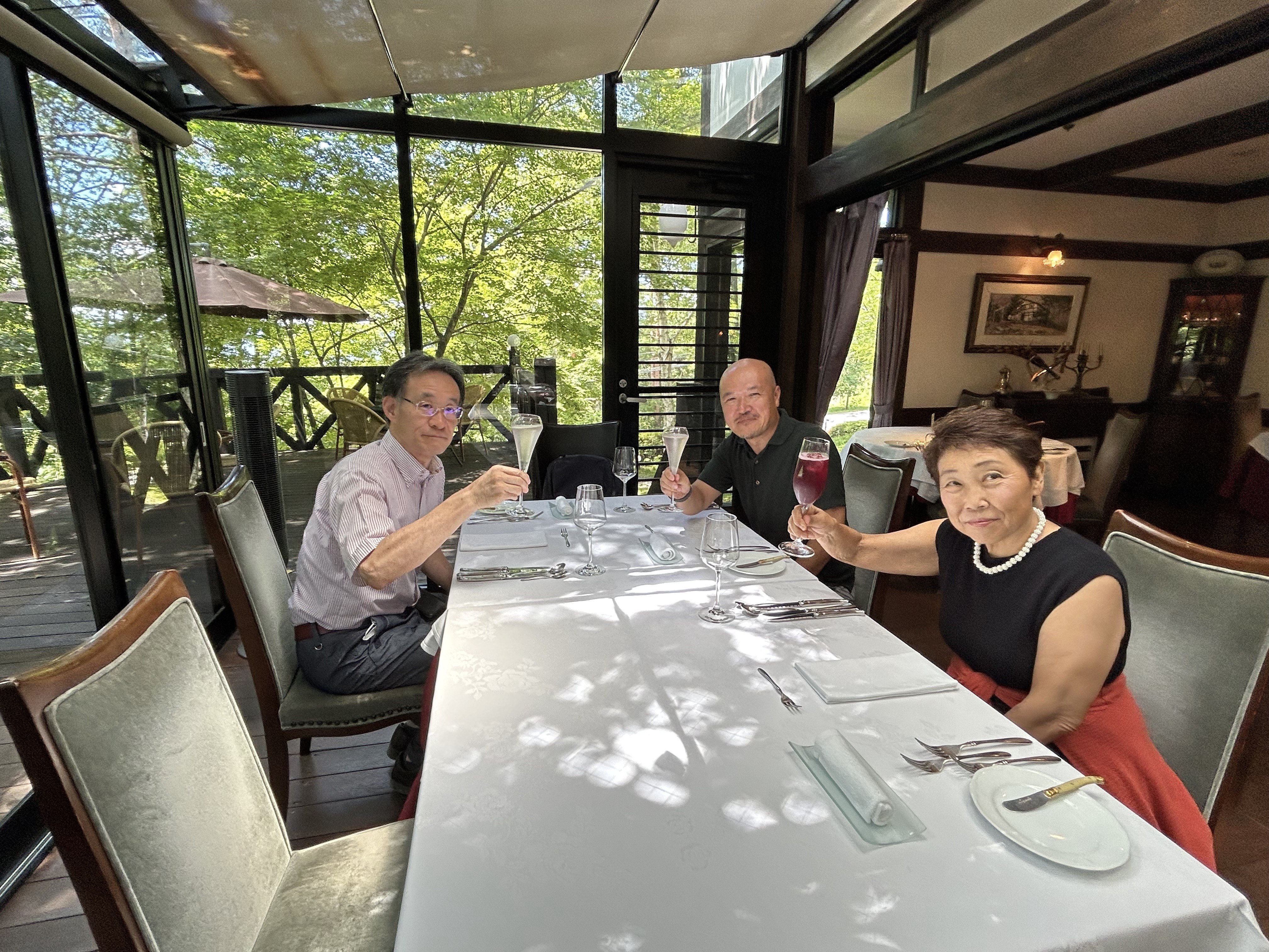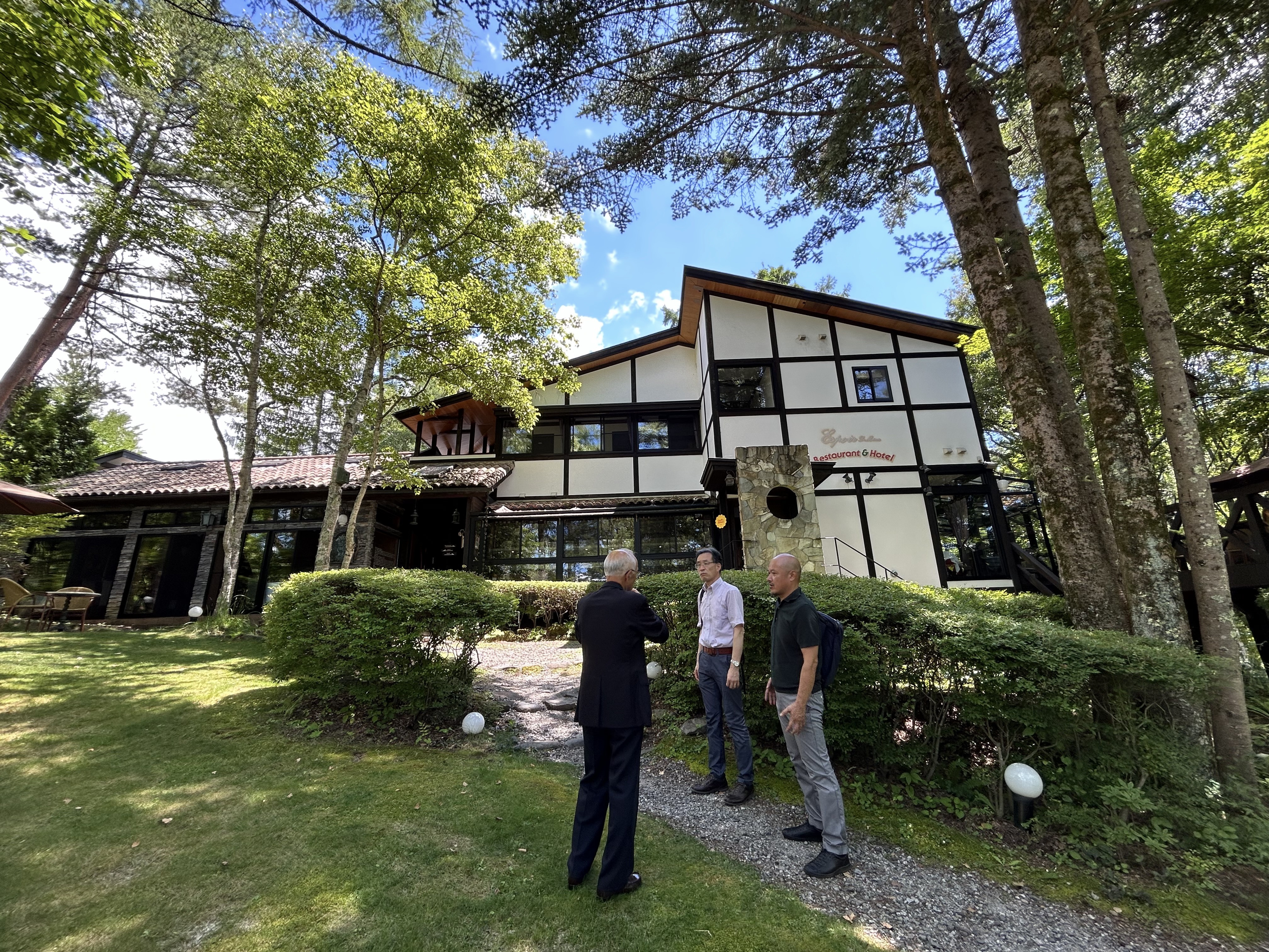 奥蓼科にあるオーベルジュ・エスポワールには、食事の予約の時間よりも随分前に着いた。その私たちよりも前に、八十二文化財団の岩渕常務は到着していたようだった。車から降りると、どこからともなく吹いてくる風に、やや湿り気を感じた。八ヶ岳の山々に囲まれた一角であっても今年は、例年のような清々しい風は吹いていない。それでも早朝まで都心にいた私たちにとって、奥蓼科の白樺やミズナラなどの木陰は抜群に心地いい。小枝や葉っぱを抜けてくる風は、身に染みついた都会の湿気や暑さをひと吹きに払ってくれた。
