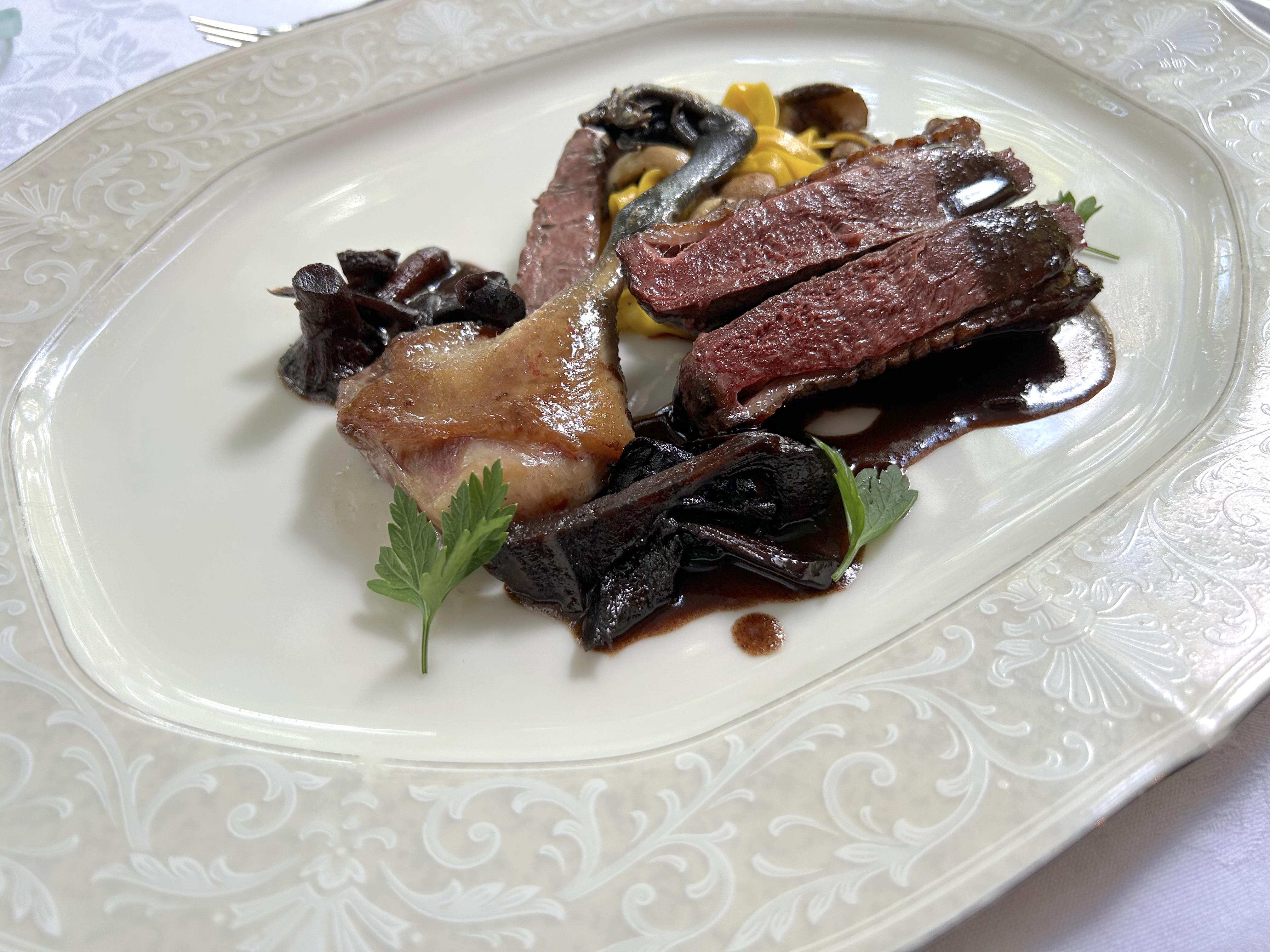 エスポワールのジビエ料理は有名だが、そうした獣の肉のみならず、季節ごとに取れるきのこや野菜などの地元の産品を活かそうという姿勢が全ての料理から感じられた。それから意表をつかれたという意味において、前菜の皿に添えられていたロールケーキは印象に残った。生クリームをスポンジの生地で包んだ中には、おそらく燻製された肉(鹿肉だろうか?)が小さく賽の目状に散りばめられていた。生クリームの甘さは抑えられており、生地の柔らかい食感を口の中で何度も楽しんでいると、突然どこからか肉の弾力が逆襲してくる。燻製特有の燻した香りが鼻を抜けていく。最初は戸惑いがあったが、二口、三口と味わっているうちに「これはありかも」と思えるのだ。また、手作りのパンが美味しい。庭にある窯で焼いたものだという。デザートは、杏が挟んであるミルフィーユを選んだ。率直に言って、杏の使い方にはもう少し工夫の余地がありそうだった。信州人なので、杏についてはちょっとうるさいです。すみません。