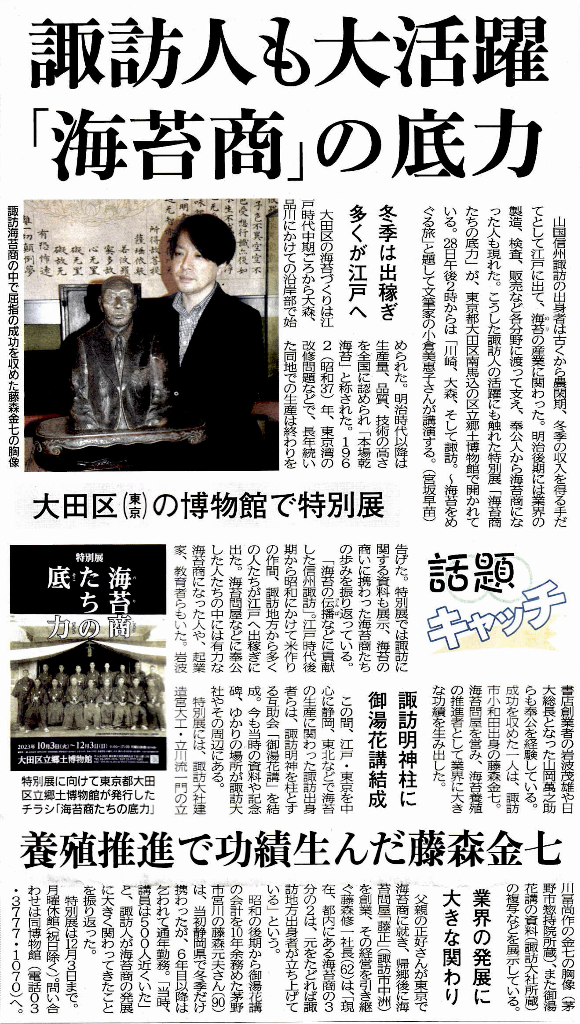 『諏訪式。』<亜紀書房刊>で、山国の信州諏訪から江戸(東京)大森に出稼ぎに出て、独自の商いを確立した「諏訪の海苔商人」について紹介したご縁から、今特別展の講師にお招きいただきました。