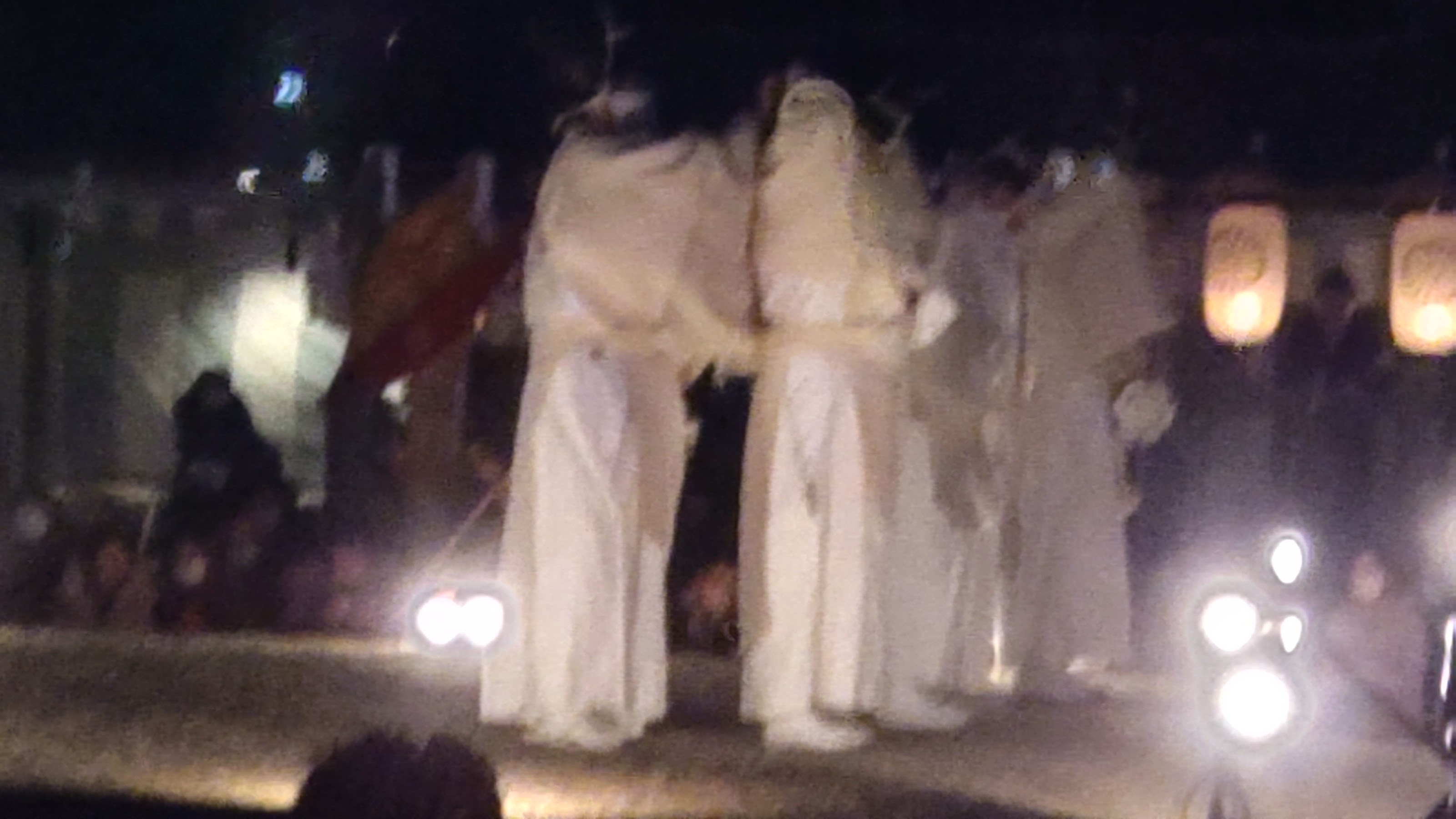 夜中に若宮様(神様)が、自分のお家を出られて1キロ先の御旅所という急遽作られた仮のお家に行かれます。御旅所(写真あり)は松の葉付きのジブリアニメに出てきそうな可愛らしいお家です。