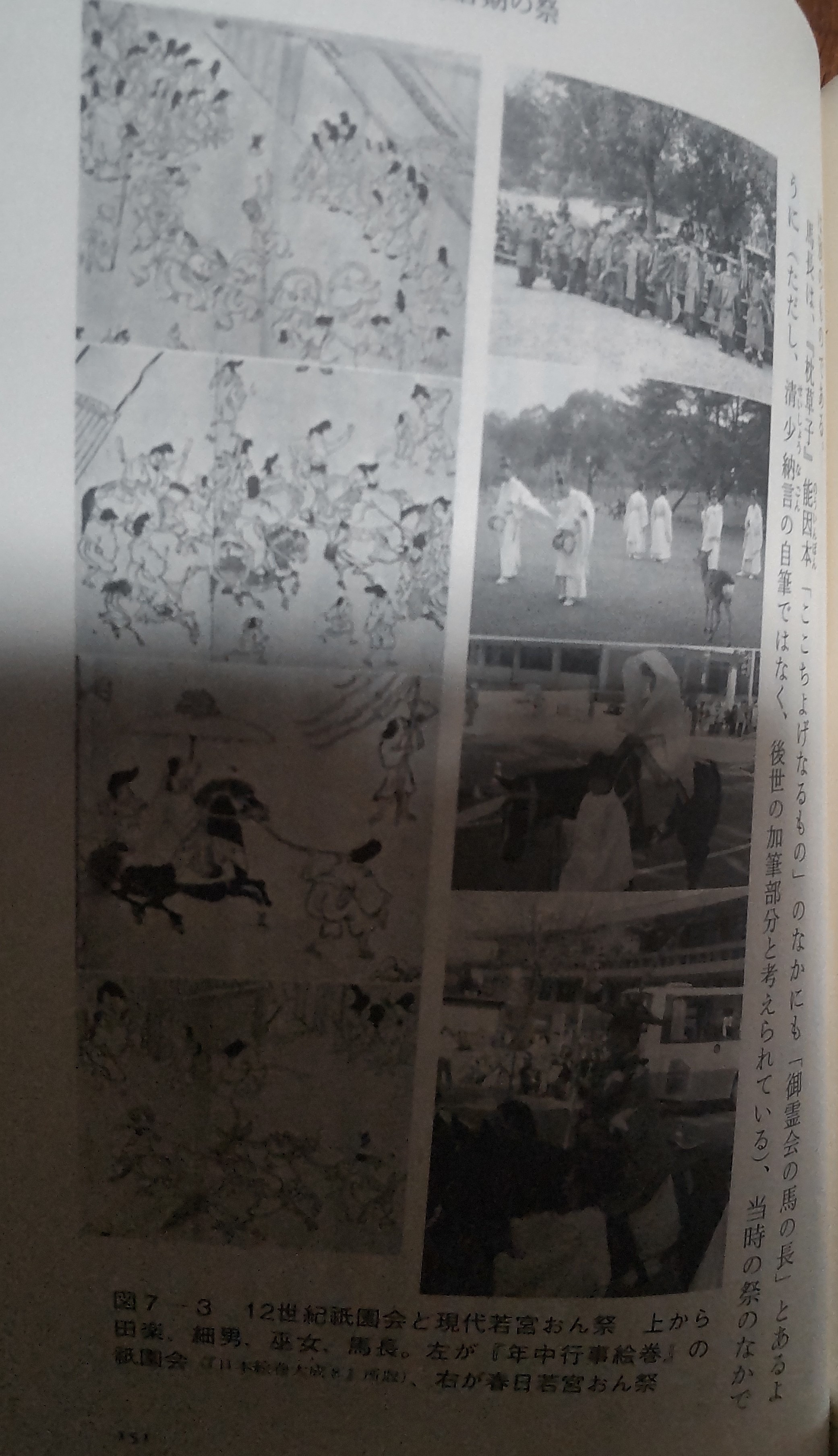 奈良の春日大社の「おんまつり」は平安末期に始まり、当時の芸能をそっくりそのまま継承しながら888年間も続いてきた大変珍しいお祭りです。京都と違って奈良は大きな戦乱(応仁の乱)に巻き込まれることがなかったため、平安をそのまま残した不思議なタイムカプセルのようなお祭りが残りました。(京都はほとんどの行事が応仁の乱で一回途絶え、古い形のまま残っているものは少ないのです)本の写真は、本田健一氏のもので「12世紀の祇園会絵巻と現在の若宮御祭りの相似」検証です。祇園会というのは現在の祇園祭ですが、祇園祭りは進化を重ね違う形になっていきました。