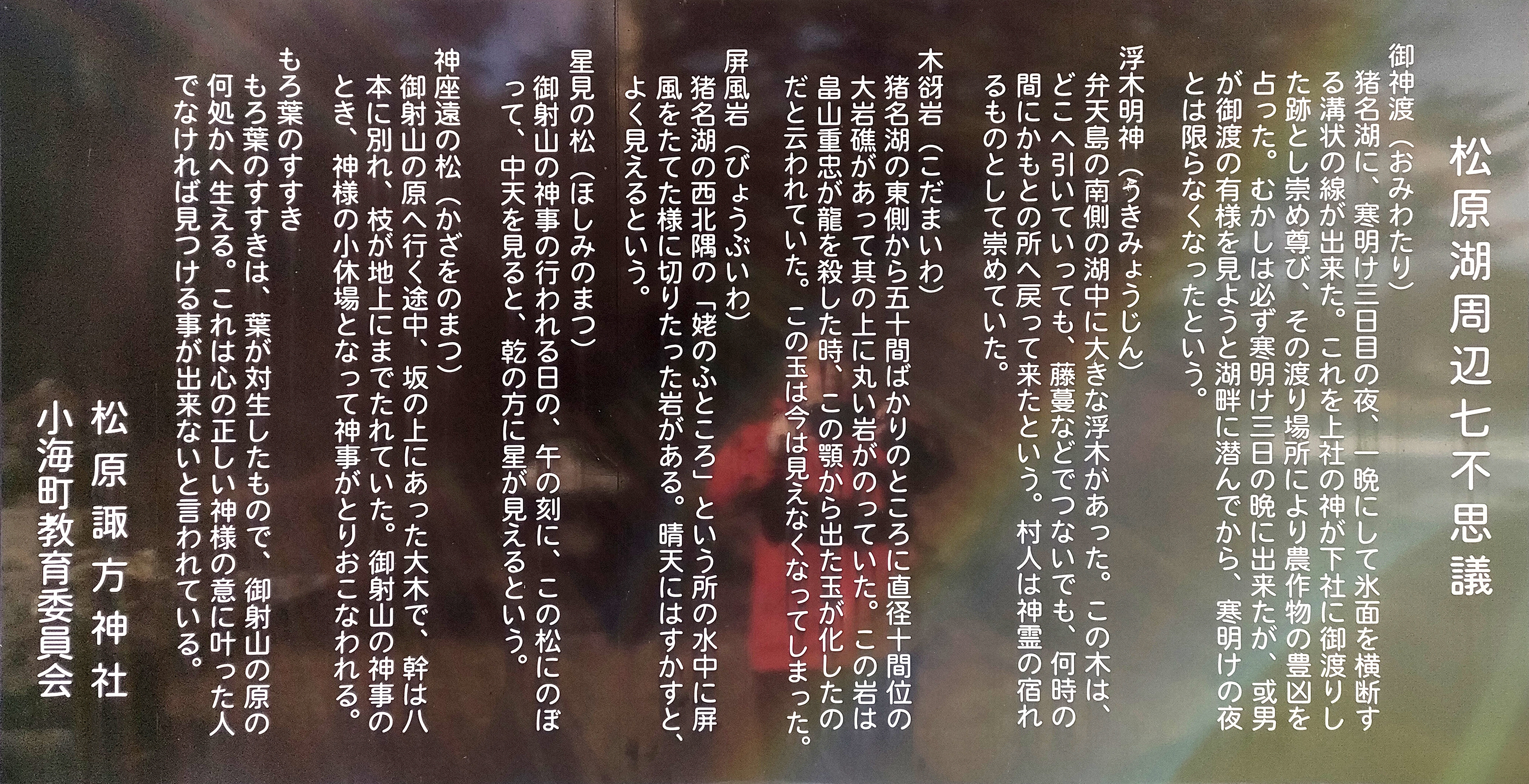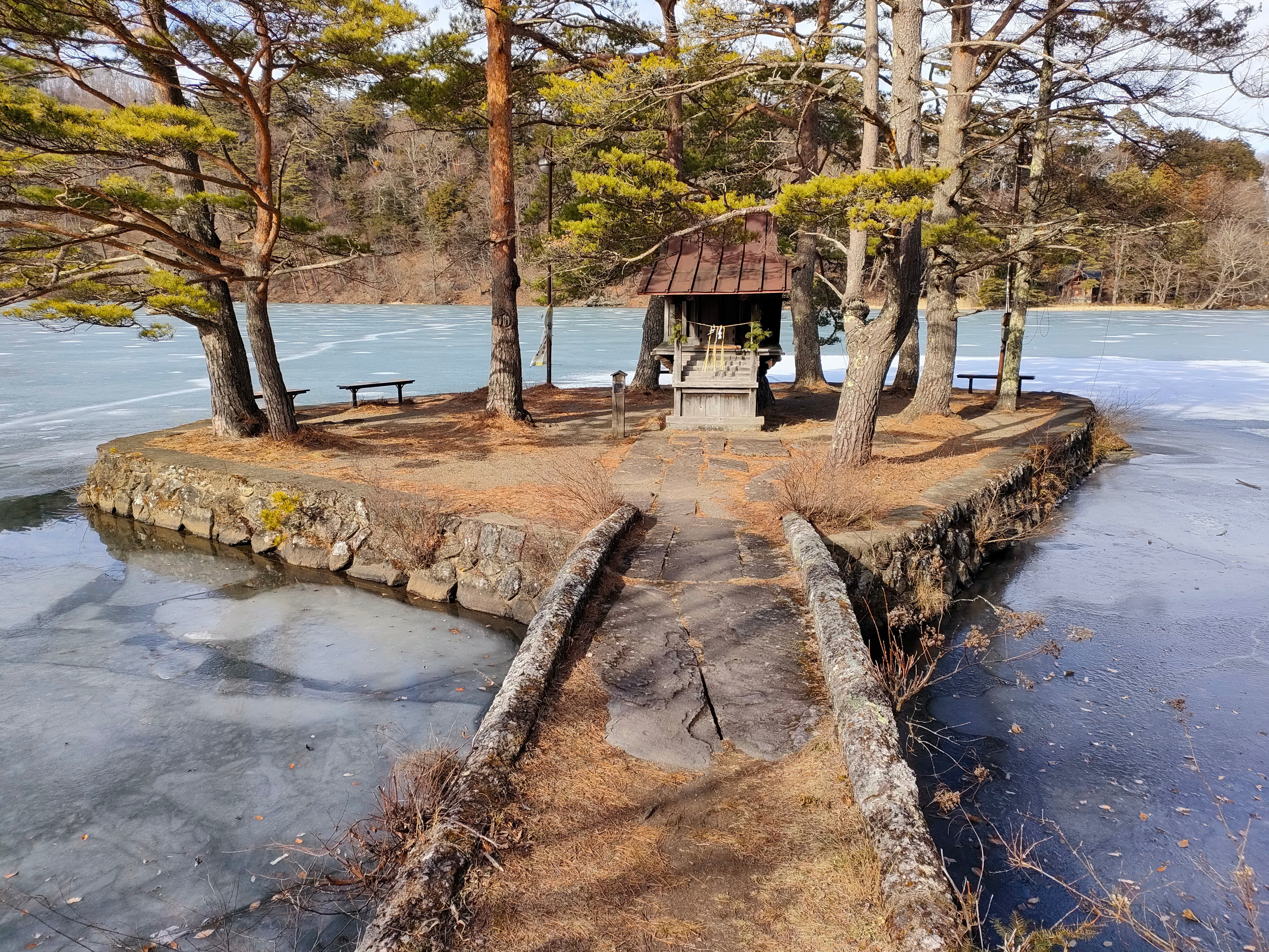2022年大晦日に小海町松原を訪問したのは、この松原湖周辺にも諏訪大社(神社)に似た祭祀形態が残っている事を学んだためである。松原湖(本来は猪名湖、長湖、大月湖の総称らしい)南東に松原諏方神社上社、その対岸に松原諏方神社下社、湖畔に弁財天など、諏訪大社の上社、下社の位置関係も似ているという。夏には御射山祭、明治までは御頭祭のような祭祀も続けられていたというから興味は膨らむ。
