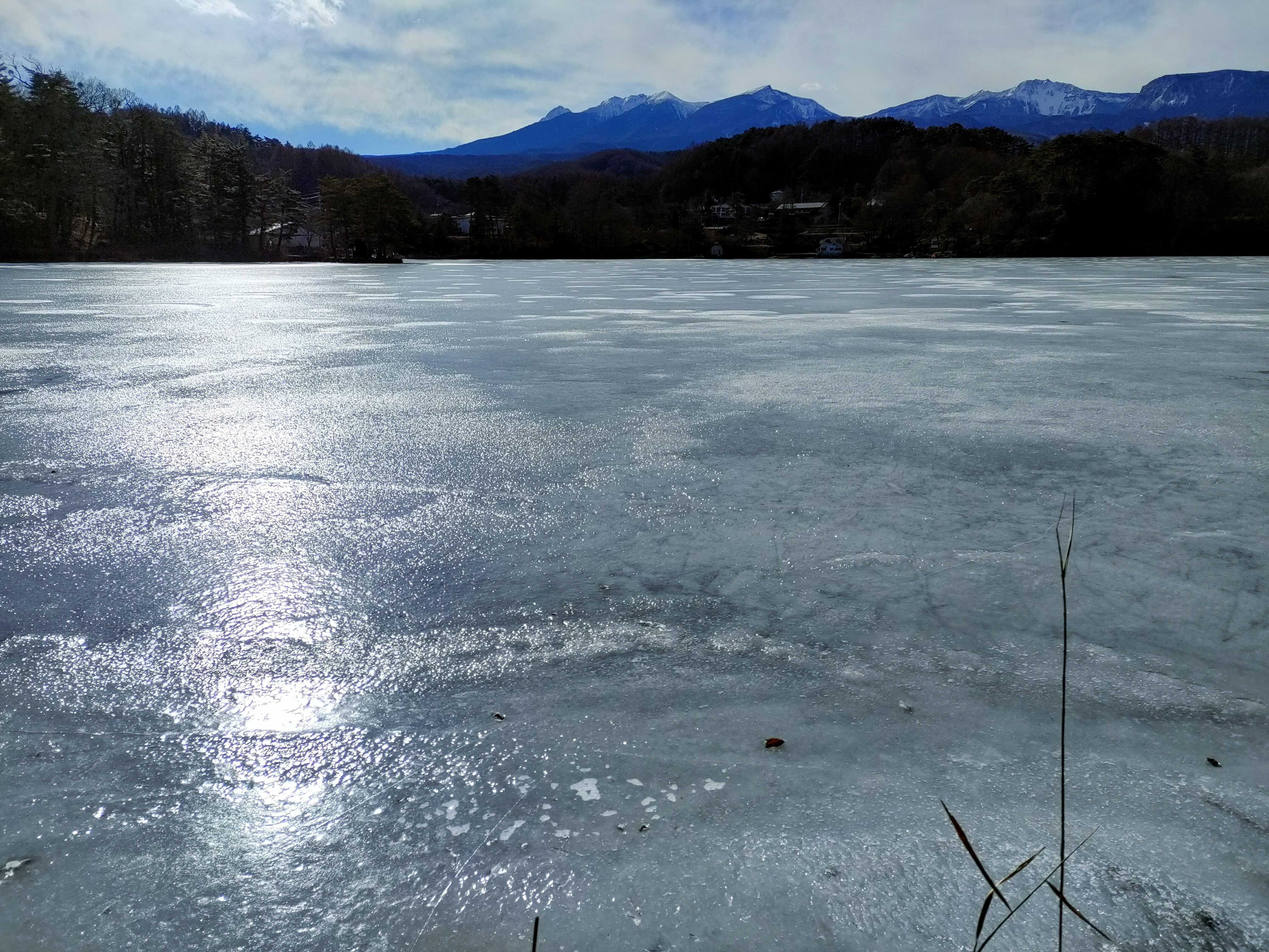 時期が時期だけに湖は全面結氷し、ワカサギ釣りを楽しむ人々が居た。そして大月湖では御渡り(本来は「御神渡り」ではなく、「御渡り」で「みわたり」と読んだらしい)の前触れとなる氷の軋む音も聞くことができた。