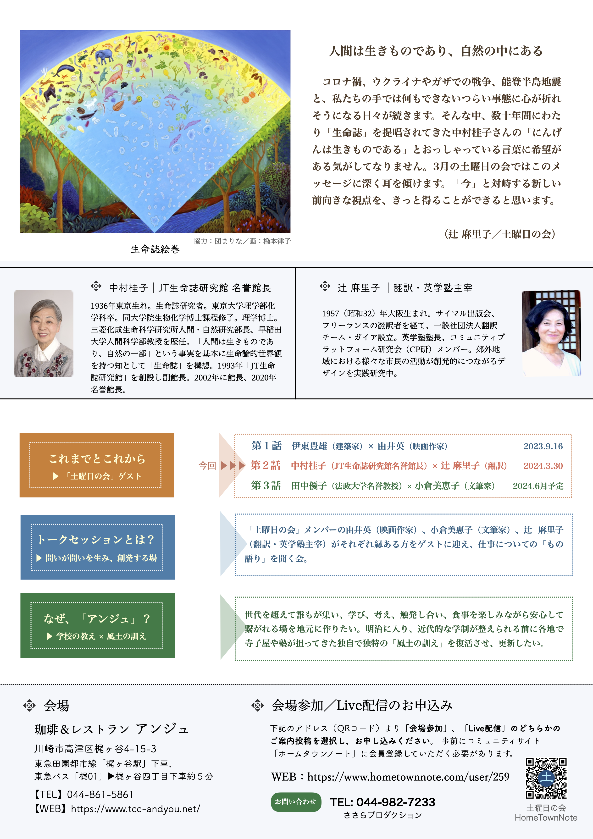 コロナ禍、ウクライナやガザでの戦争、能登半島地震と、私たちの手では何もできないつらい事態に心が折れそうになる日々が続きます。そんな中、数十年間にわたり「生命誌」を提唱されてきた中村桂子さんの「にんげんは生きものである」とおっしゃっている言葉に希望がある気がしてなりません。3月の土曜日の会ではこのメッセージに深く耳を傾けます。「今」と対峙する新しい前向きな視点を、きっと得ることができると思います。(辻麻里子/土曜日の会)