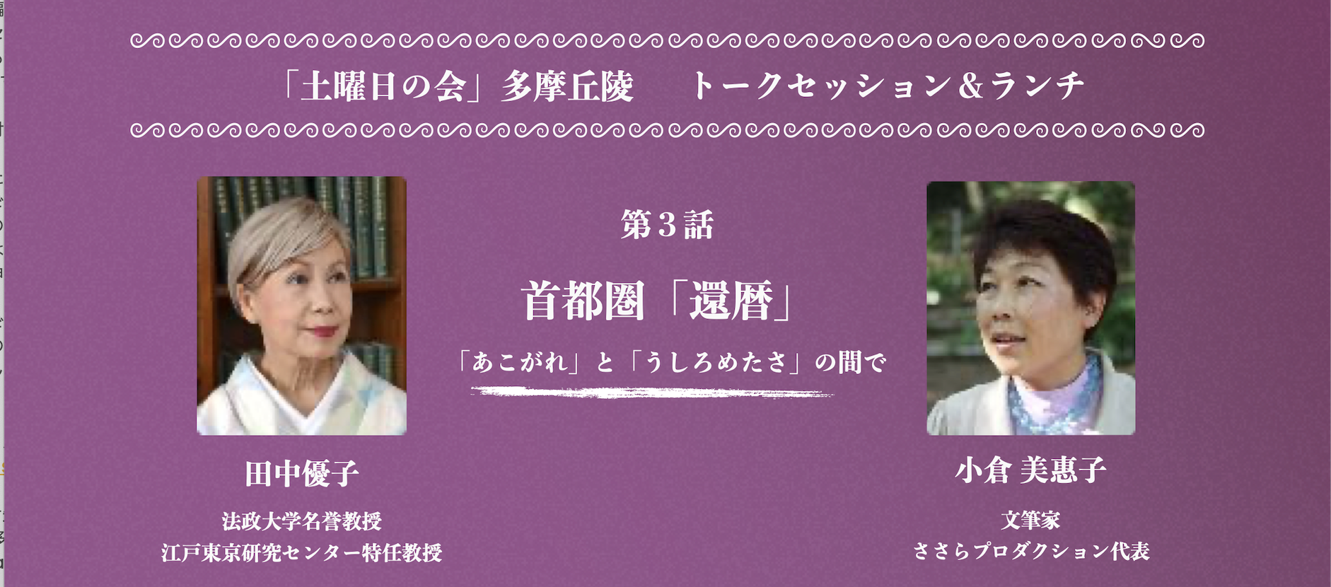 古来に倣い60年の節目を「首都圏還暦」と呼んでみると、異なる風景が見えてくるかもしれません。巡る暦の中にあった「江戸」の知恵を田中優子さんとひもときながら、「この地域のこれから」について考えたいと思います。(⼩倉)