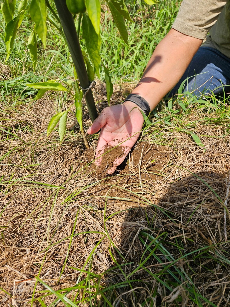 今年はさすがに暑いので、天気の具合、土の湿り気を確認し、必要に応じて水を撒かれているとのこと。先日、大雨の日もあったし、土は湿っているから大丈夫。・・・表面からだと分からない。表面の草と土を少し寄せて、手で触って確認してみる。表面の土より色が濃く、湿り気がある。いくらかひんやりとする。土の中の方が涼しそう。