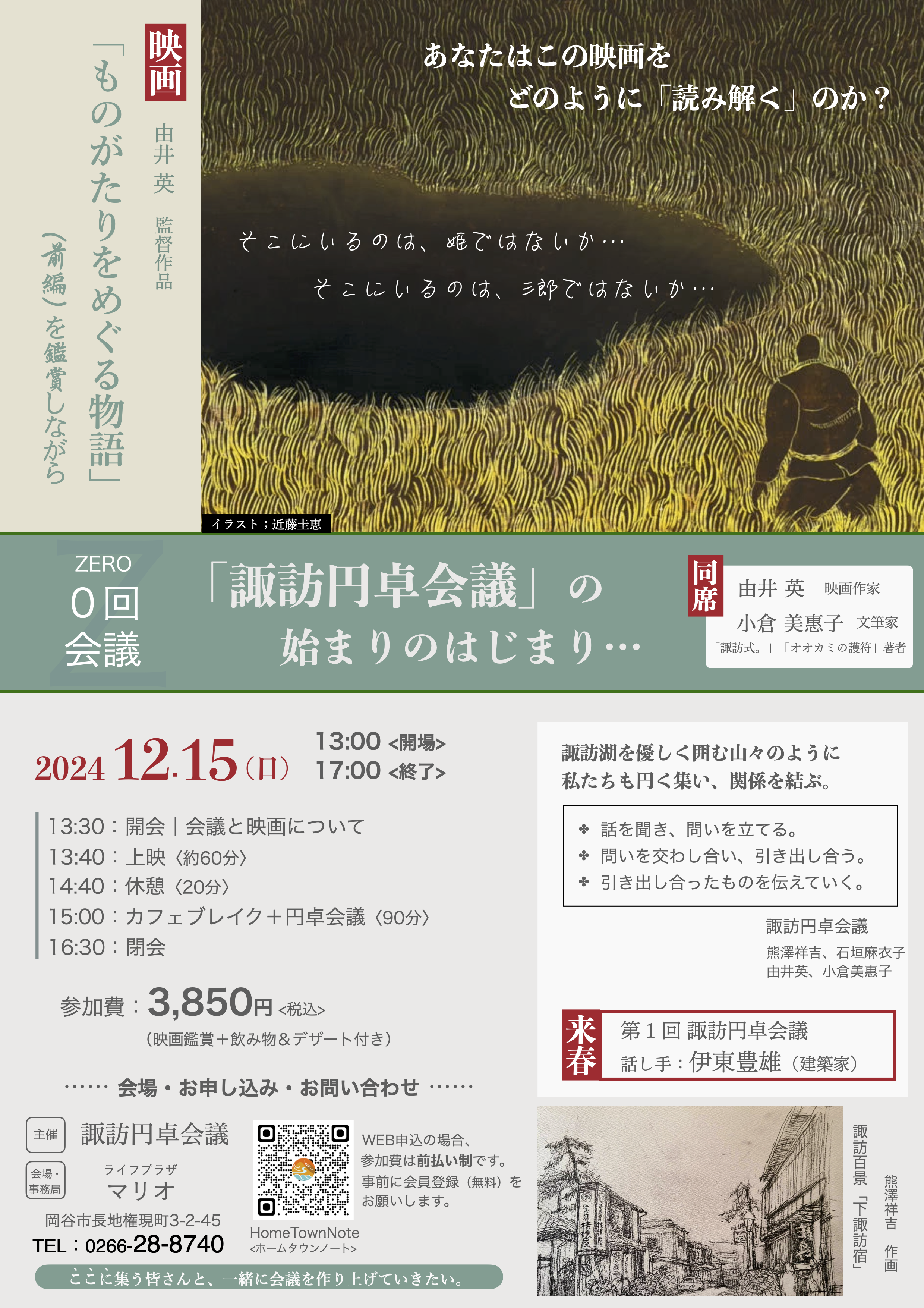 ZERO回は諏訪円卓会議の事実上の発足式であり、今回はゲストのお話の代わりに映画「ものがたりをめぐる物語(前編)」を入り口として、皆さんと共に問いを立ててみたいと思います。私たちはZERO回に集う人たちと共に、今後、諏訪円卓会議を作り上げていきたいと考えております。いずれ私たちの仲間となる方々が諏訪内外から集まってくれることを願っています。