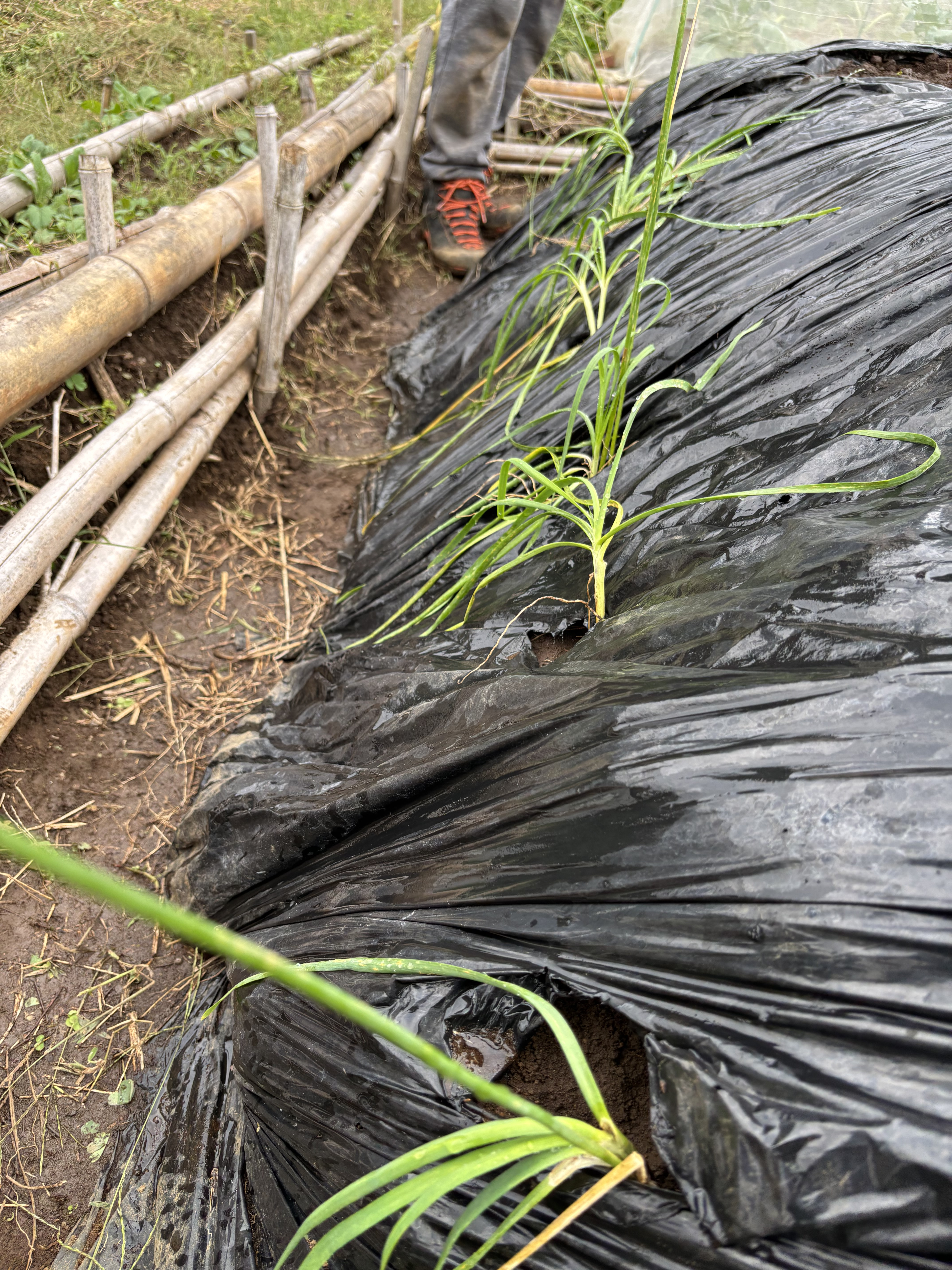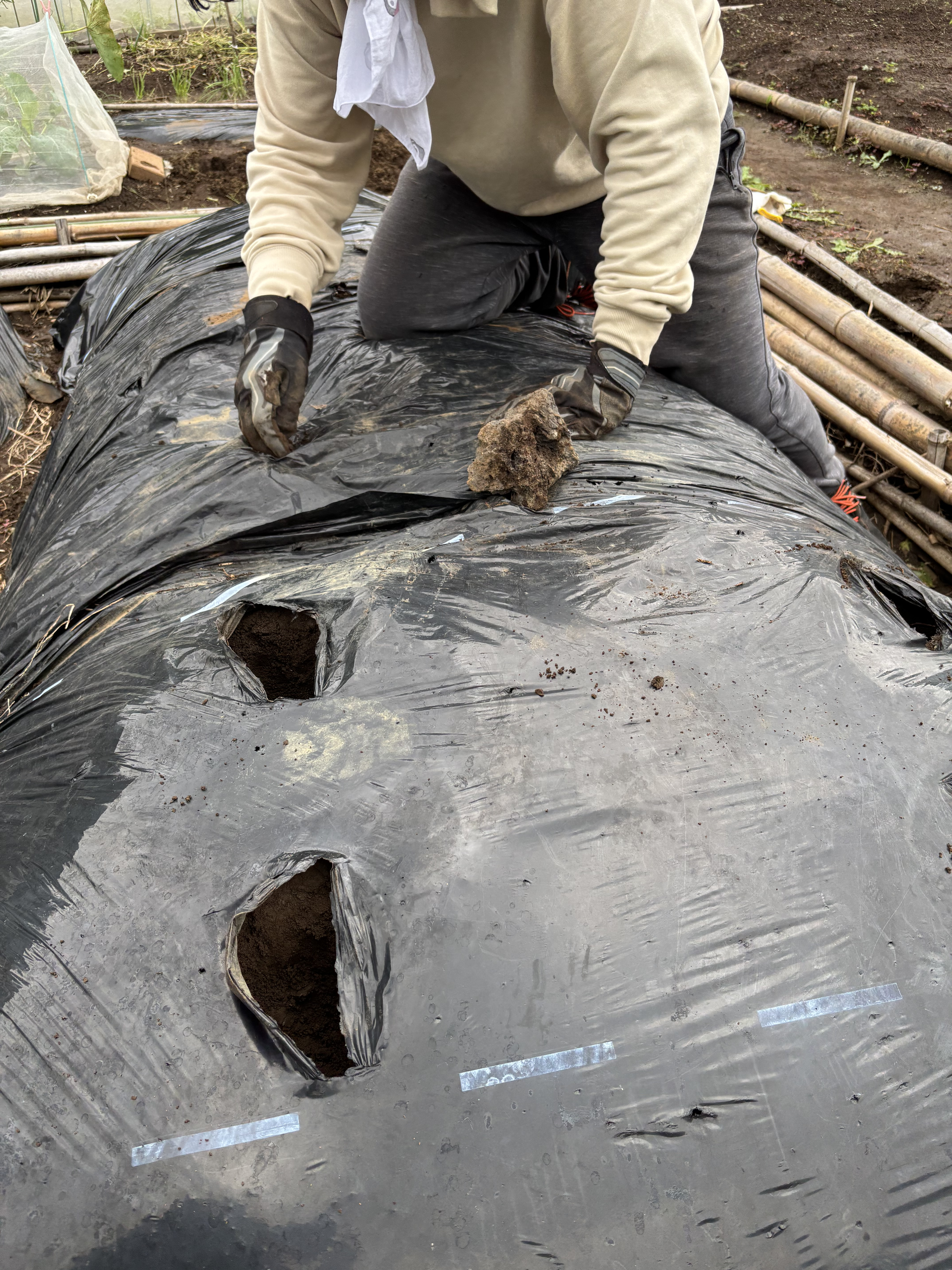 今回耕す一枚の畑は、「菌ちゃん農法」を採用している。すでに土づくりは夏の間に終えているようで、その畝は古墳のようなこんもり山である。黒いマルチの下には有機堆肥が隠れている。この中で土と有機物が入り混じり、栄養を蓄えることができるらしい。しかも一度立てた畝は有機物を補充してずーっと使うという。