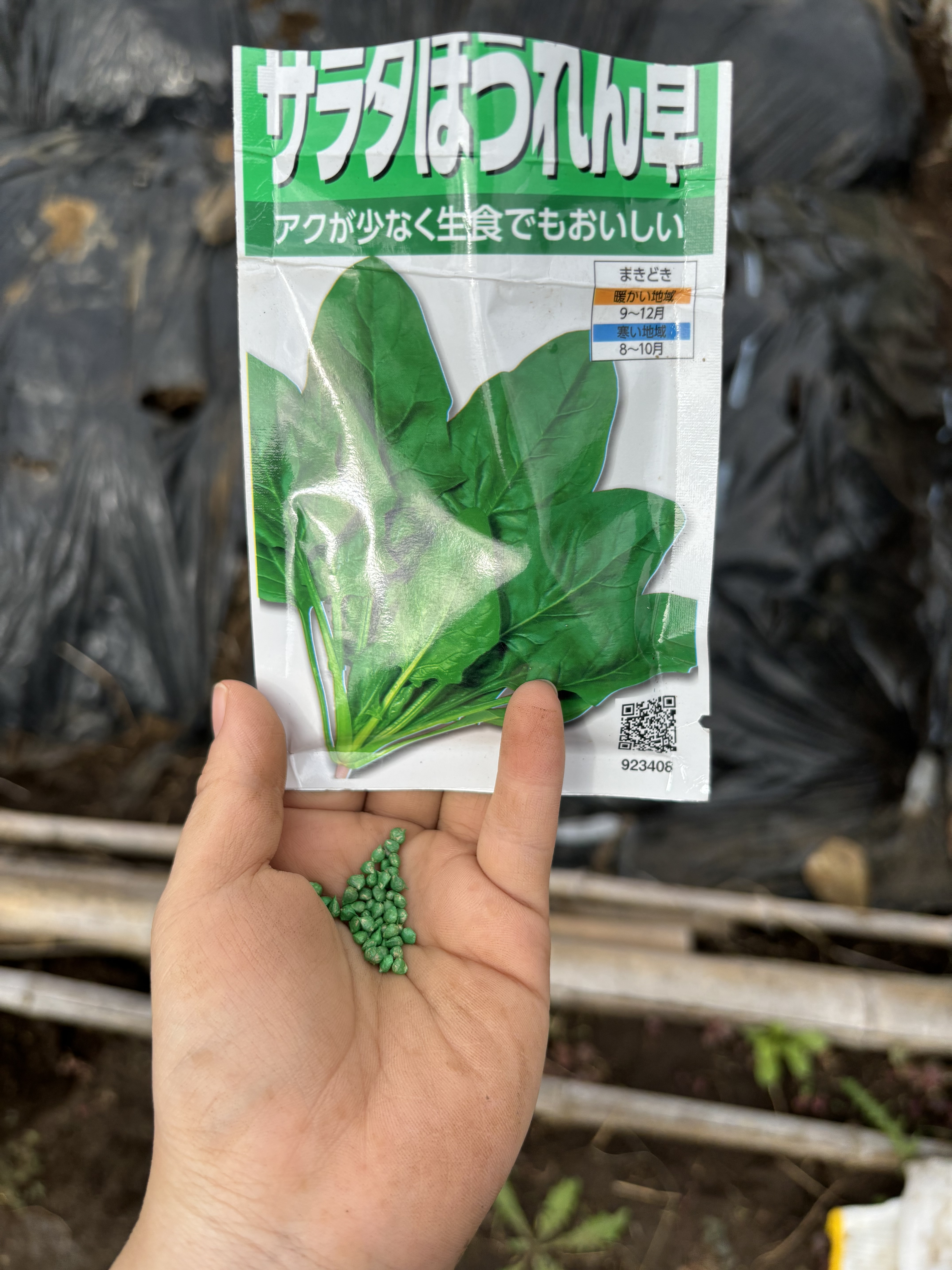 今日1番驚いたのは種のこと。なんとにんじんとほうれん草の種がカラフルである!にんじんの種は青くキラキラと光っているし、ほうれん草の種は鮮やかな緑色だ。ムムム・・・。どう考えても人工的である。表示をよく見ると、「チウラム/キャプタン各1回処理済み」と書いてある。アメリカからやってきたその種にはおそらく何かが施されている。怖くて調べられないが、これが噂の消毒ってやつか!あまりに土に馴染まないそのカラーを”個性”と呼ぶには少し抵抗がある。発芽するのかが一番の関心だ。