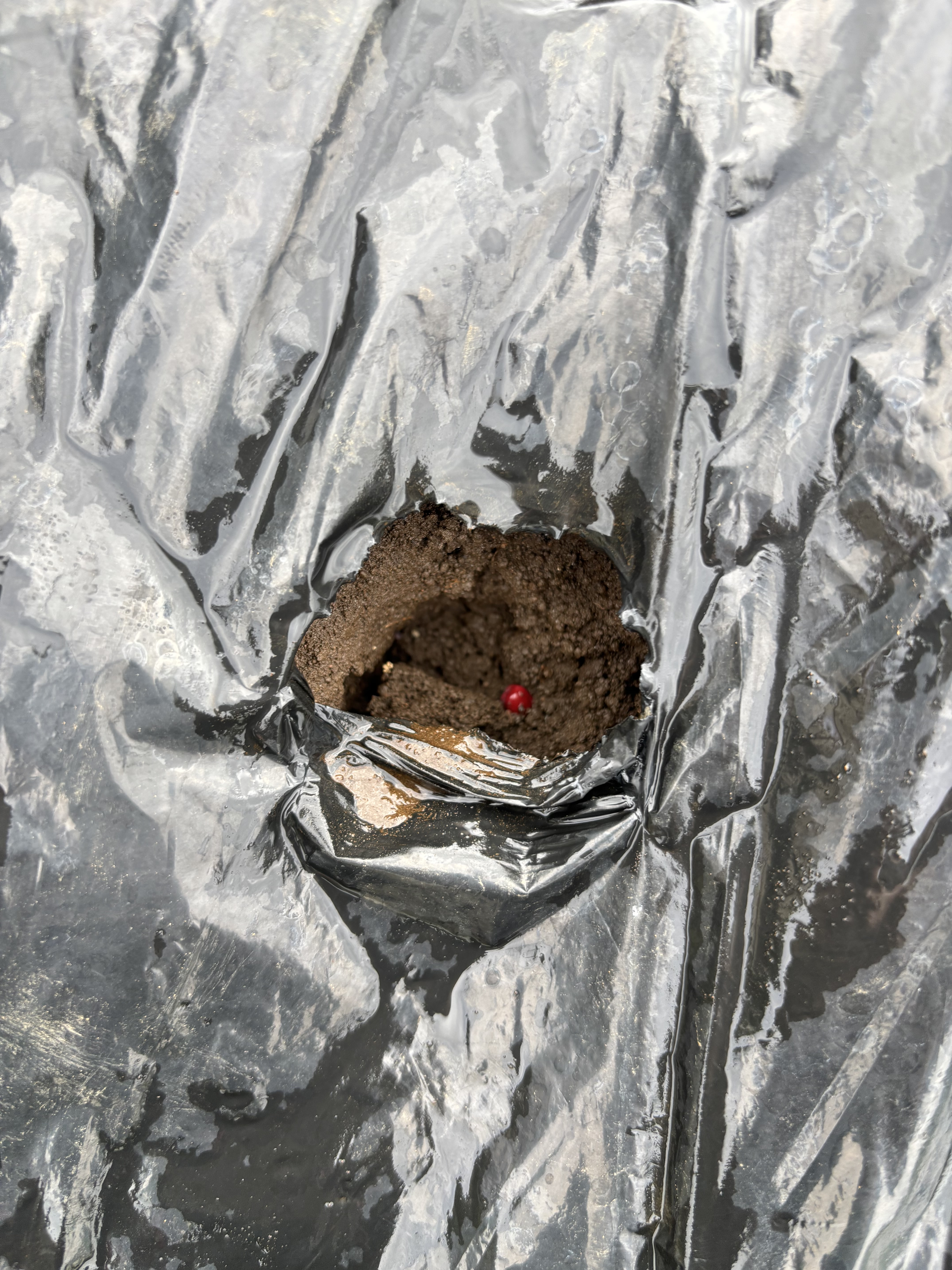 とりあえず、黒マルチにカッターで切り込みを入れる。多分この野菜はこれくらいの間隔がいいのだろうと予想して、あとは手で破って穴を広げる。穴の真下の土をグ―パンチで押し固める。(これのおかげで覆土し活着させる必要がないらしい)そこに種を2,3粒蒔く。はい完成!播種後、種がむき出しなのは驚きだ。自然に周りの土が崩れてくるのを待つらしい。