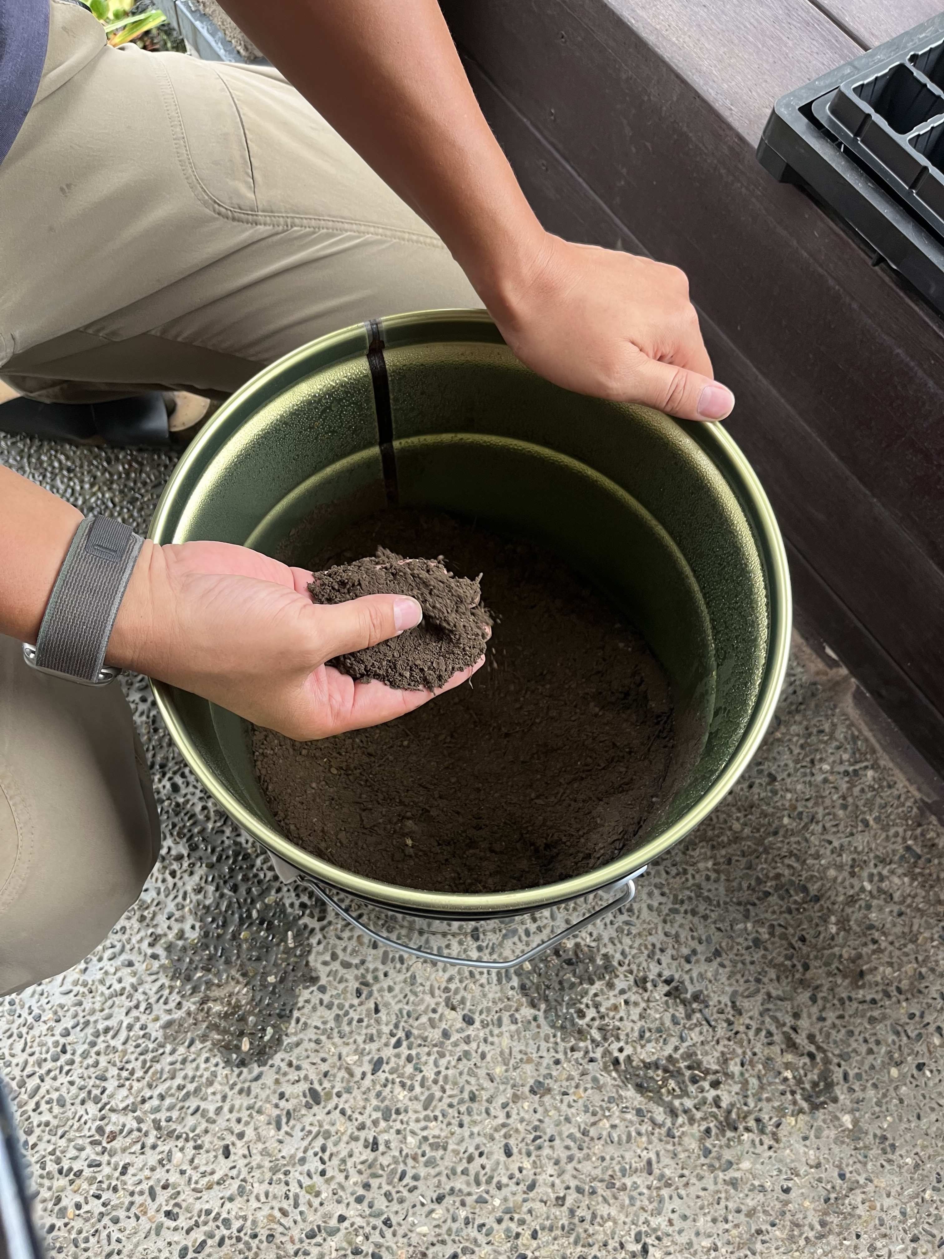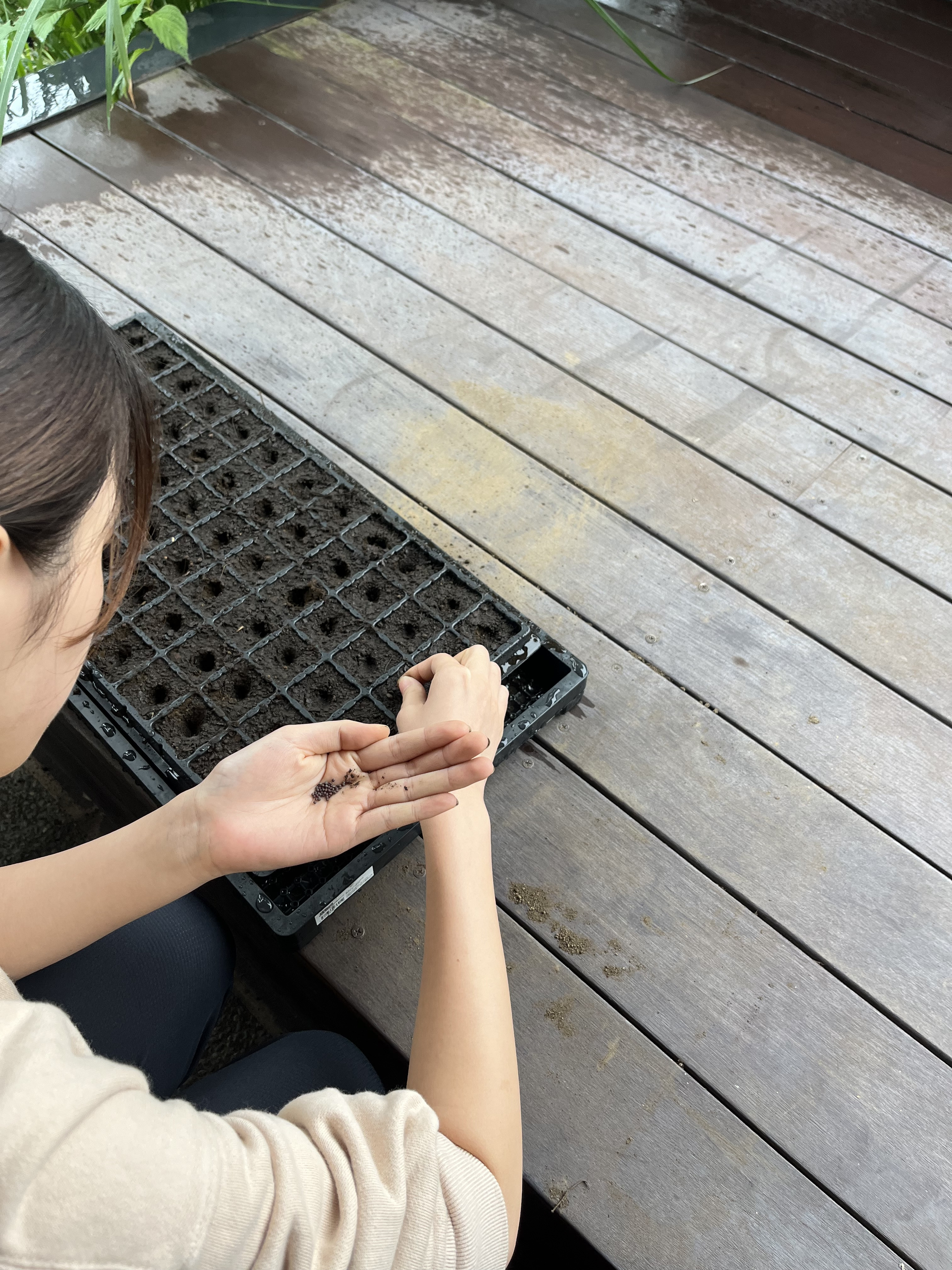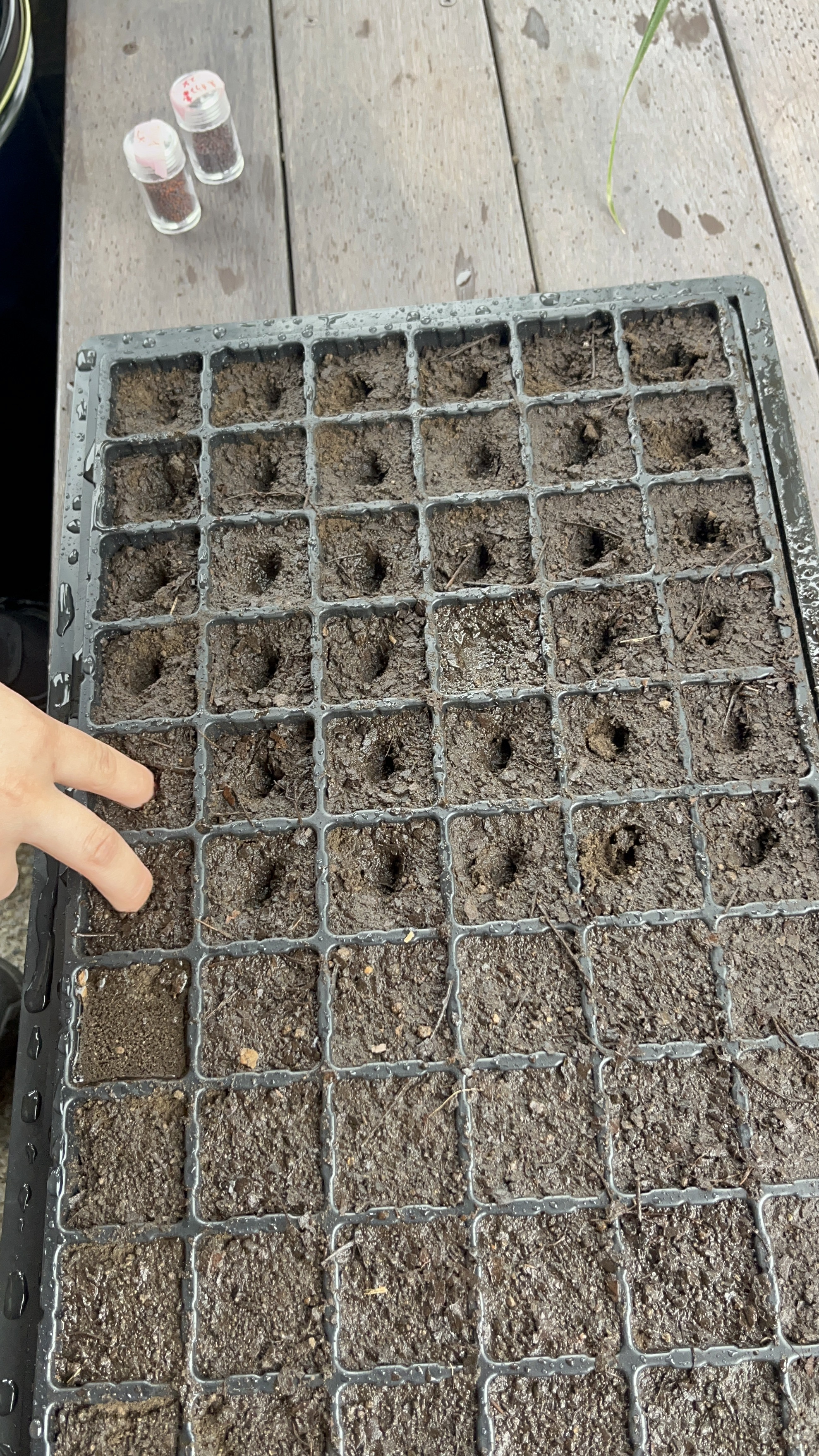 その後は、育苗トレーにかつお菜とからし菜の種をまいた。6×12マスのトレーに土を入れ、指の第一関節が埋まらない程度まで穴を開ける。指をピースの形にして2列ずつブスブスと指していく。ブスブスというよりかはブヒブヒという感じがして笑ってしまった🐷