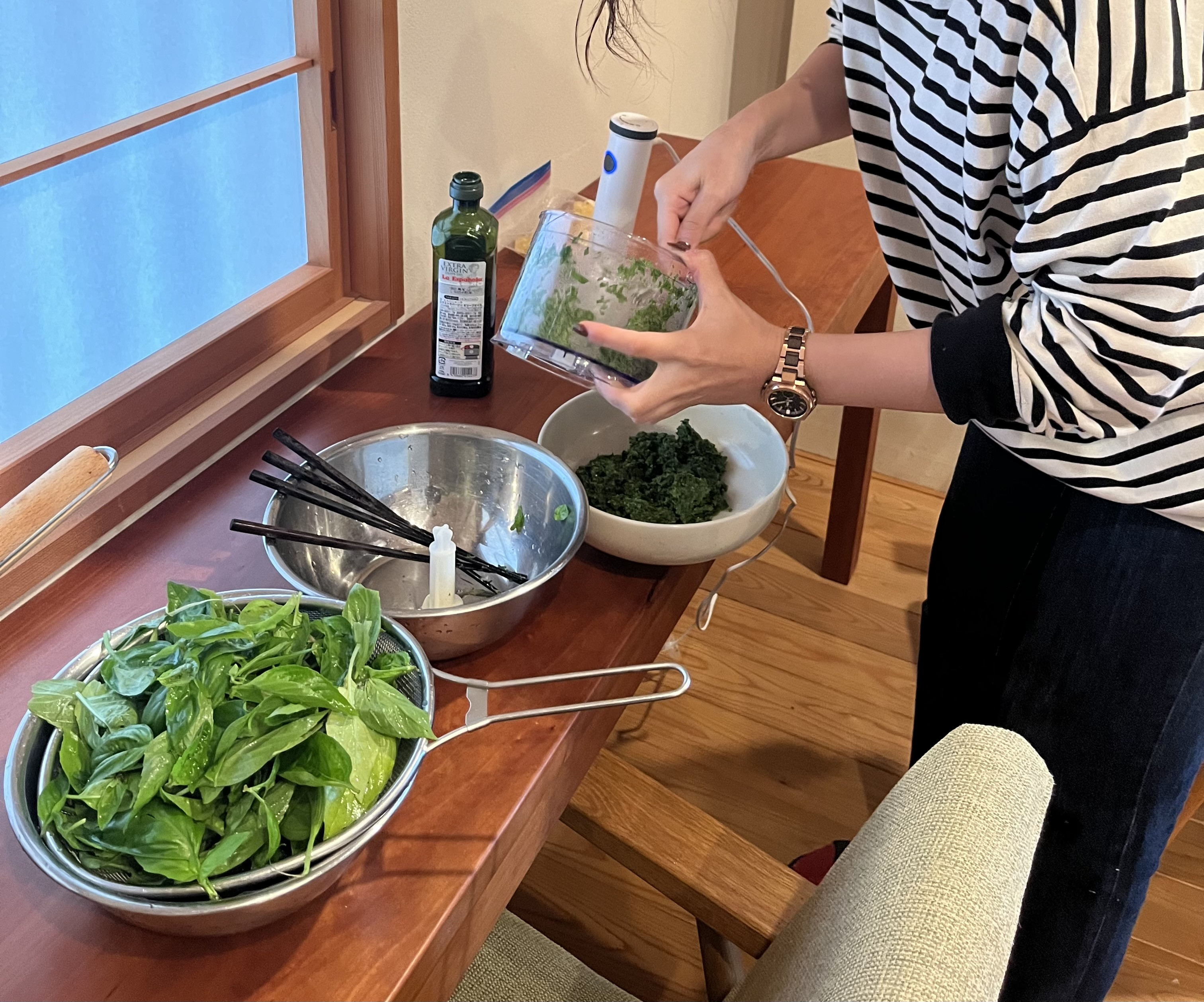 畑での作業の後は、お昼ご飯の用意。バジルの葉を摘み取り、フードプロセッサーにかけ、ペーストにした。やり終えるまでかなりの時間を要したが、入れる葉の量を少なくして二回に分けて回すことで少しずつ効率が上がっていった気がする。