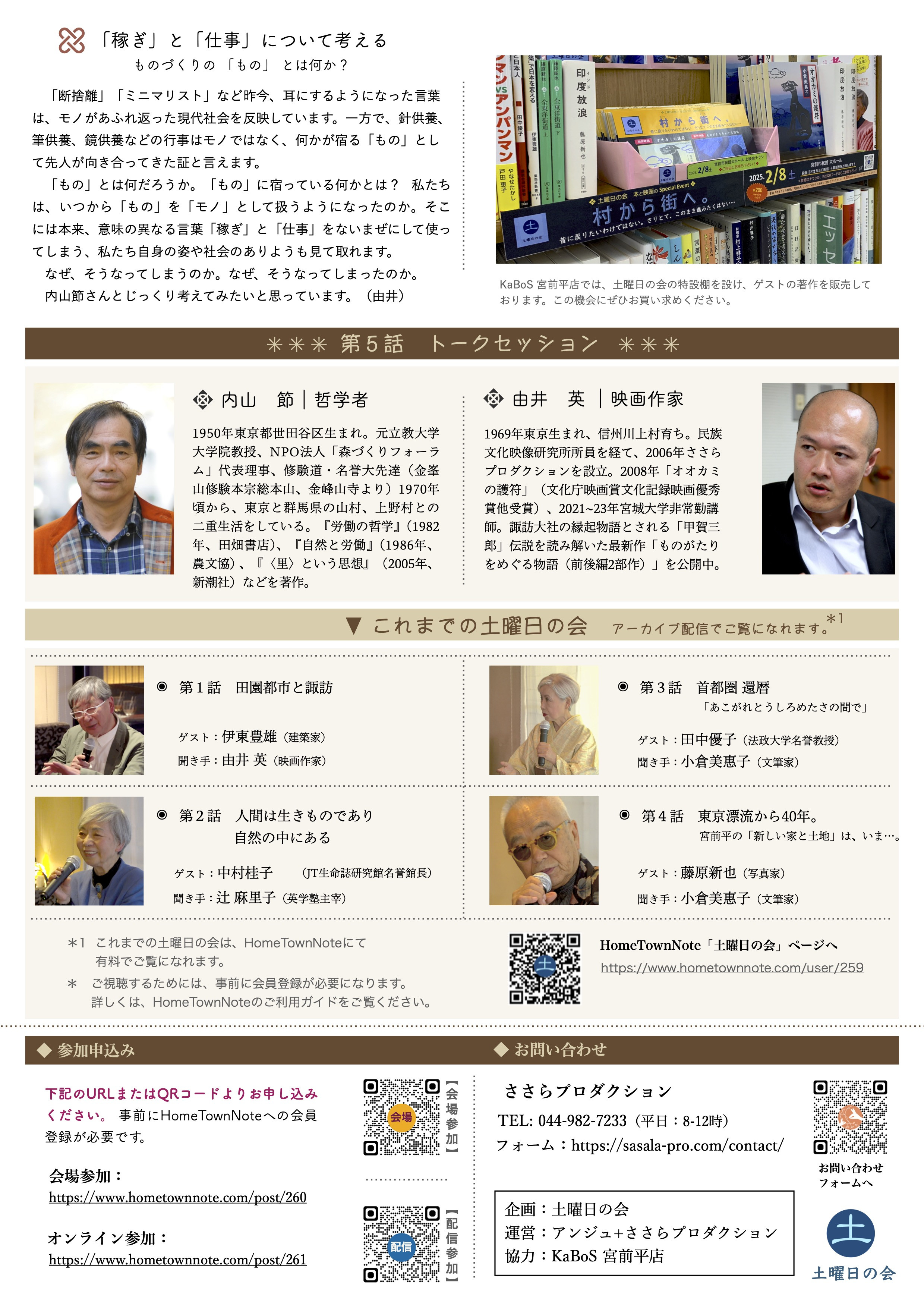 「もの」とは何だろうか。「もの」に宿っている何かとは? 私たちは、いつから「もの」を「モノ」として扱うようになったのか。そこには本来、意味の異なる言葉である「稼ぎ」と「仕事」をないまぜにして使ってしまう、私たち自身の姿や社会のありようも見て取れます。なぜ、そうなってしまうのか。なぜ、そうなってしまったのか。内山節さんとじっくり考えてみたいと思っています。(由井)