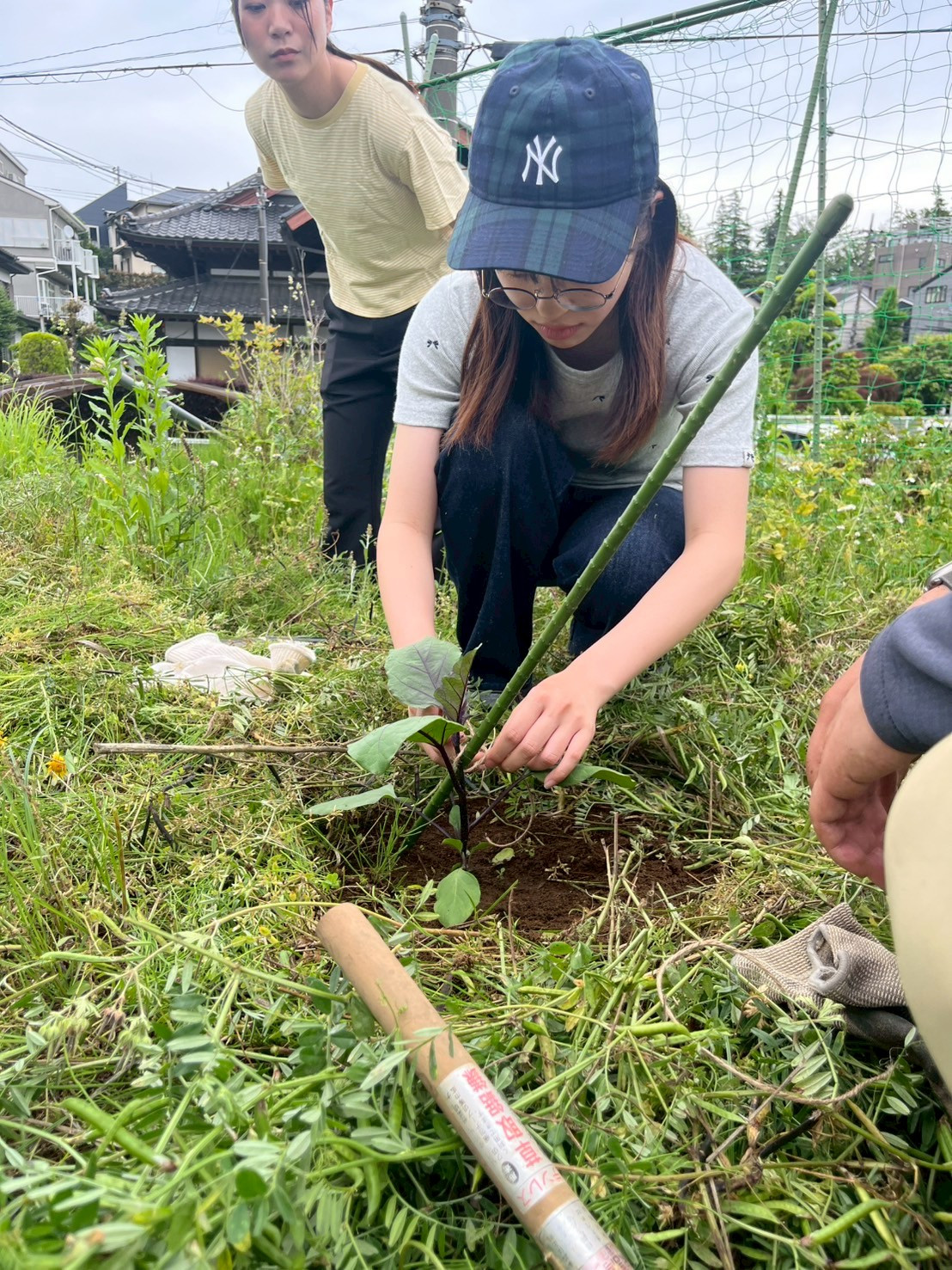 ナスとトマトの苗は大きくなることを想定して、支柱を立てる。根を傷つけないように斜めに棒を刺したら、接点の部分を麻紐で結ぶ。この結ぶ作業にみなで苦戦した。まだまだ農民への道は長い。