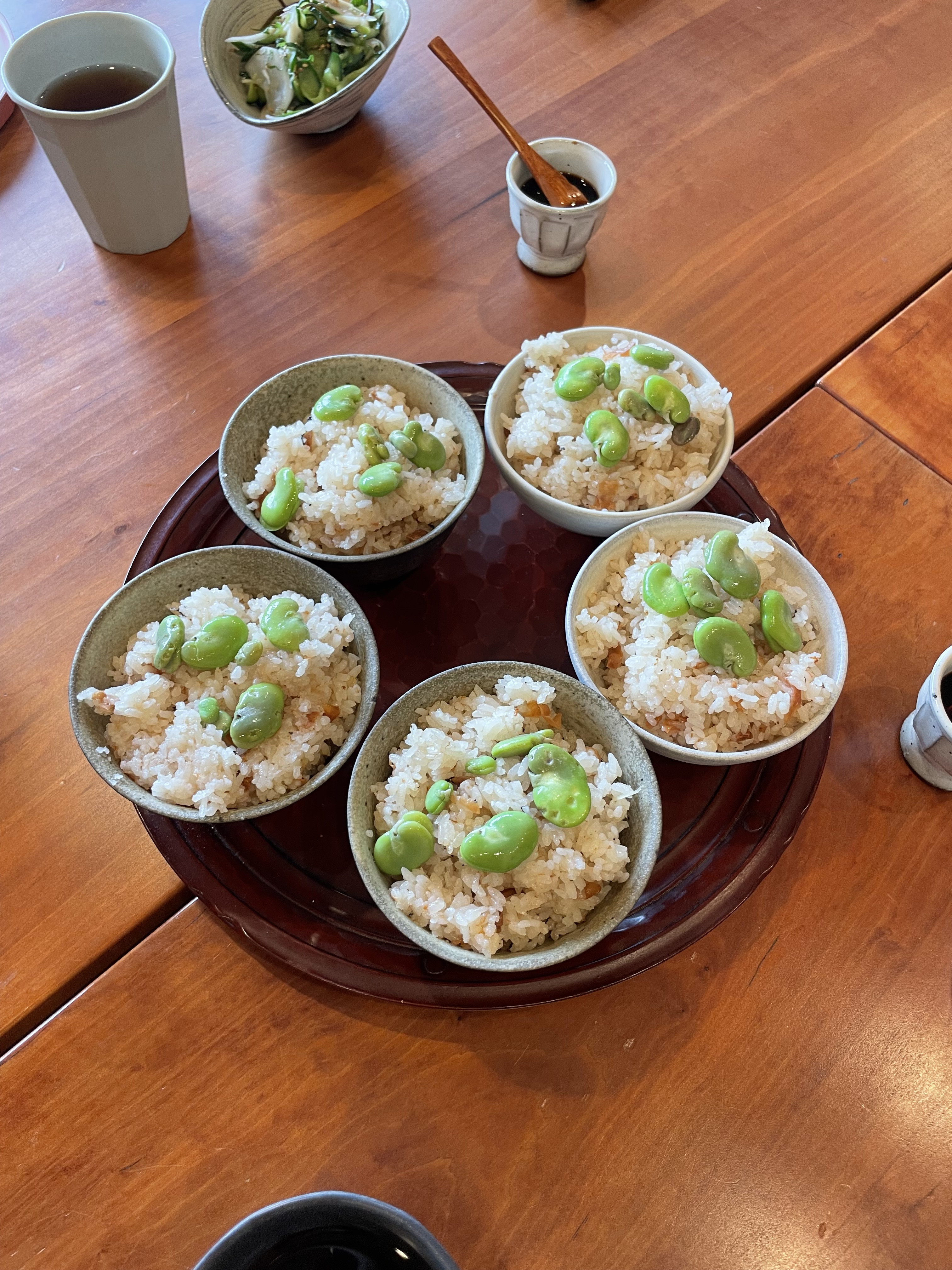 黒い筋を割くと、真っ白でふかふかのベッド。蚕豆は淡い緑色をしていて、気持ちよさそうに寝ている(豆は左右交互についている)。畑には二種類の蚕豆が植わっていて、一つは一般的な緑色、もう一つは赤色だ。赤いのは皮だけで、皮を剥いだ中は緑色なのだそう。お昼には、梅干しで炊き、そらまめをのせたご飯を用意していただいた。つやつやと輝くそらまめは食べるのが惜しいほど美しいが、空腹に打ち勝つことはできず、ありがたくいただく。春と初夏の味。とても美味しい。前回から、その日の活動の終わりに振り返りの動画を撮影しているのだが、今回は皆で収穫した蚕豆をマイクに見立てて話した。一時間ほど握りしめていたおかげで、蚕豆の触り心地が自分の手に染み付く始末であった。
