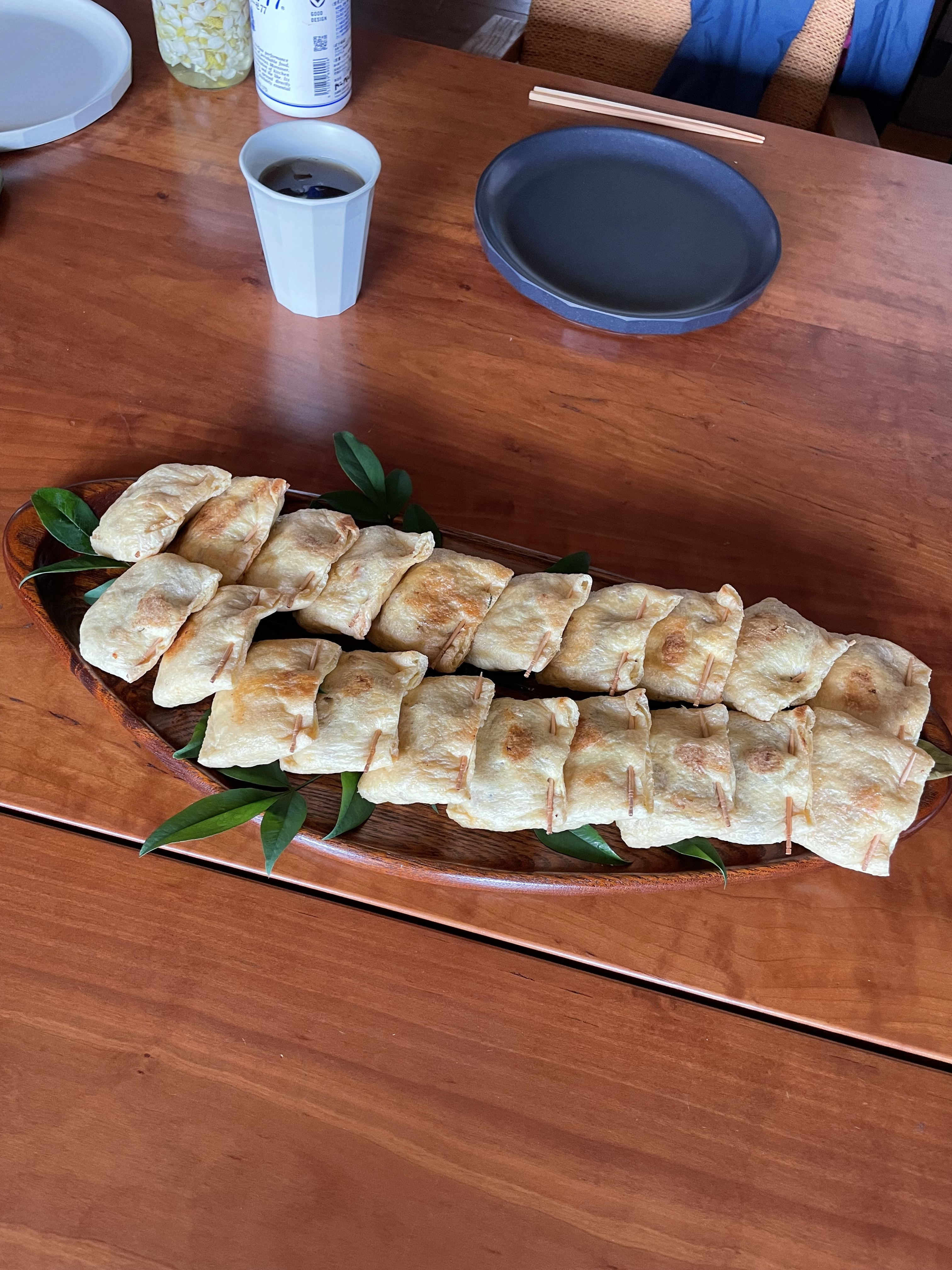 今回のごはんの中での私の一推しは、油揚げコロッケ。畑から戻ると、机の上に、何かが詰められた油揚げがずらりと並んでいた。わあ、という黄色い歓声と同時に、何が入っているんだろう?という声が上がる。コロッケと言われたが、半信半疑で一口。これは、、、コロッケだ!単にじゃがいもが詰められているわけではなく、油揚げがちょうど衣の代わりになって、味わいはほとんどコロッケと変わらない。揚げ物を家で作るとなると少々面倒だが、これならフライパンさえあれば作ることができる。今度家でも作ってみよう♪