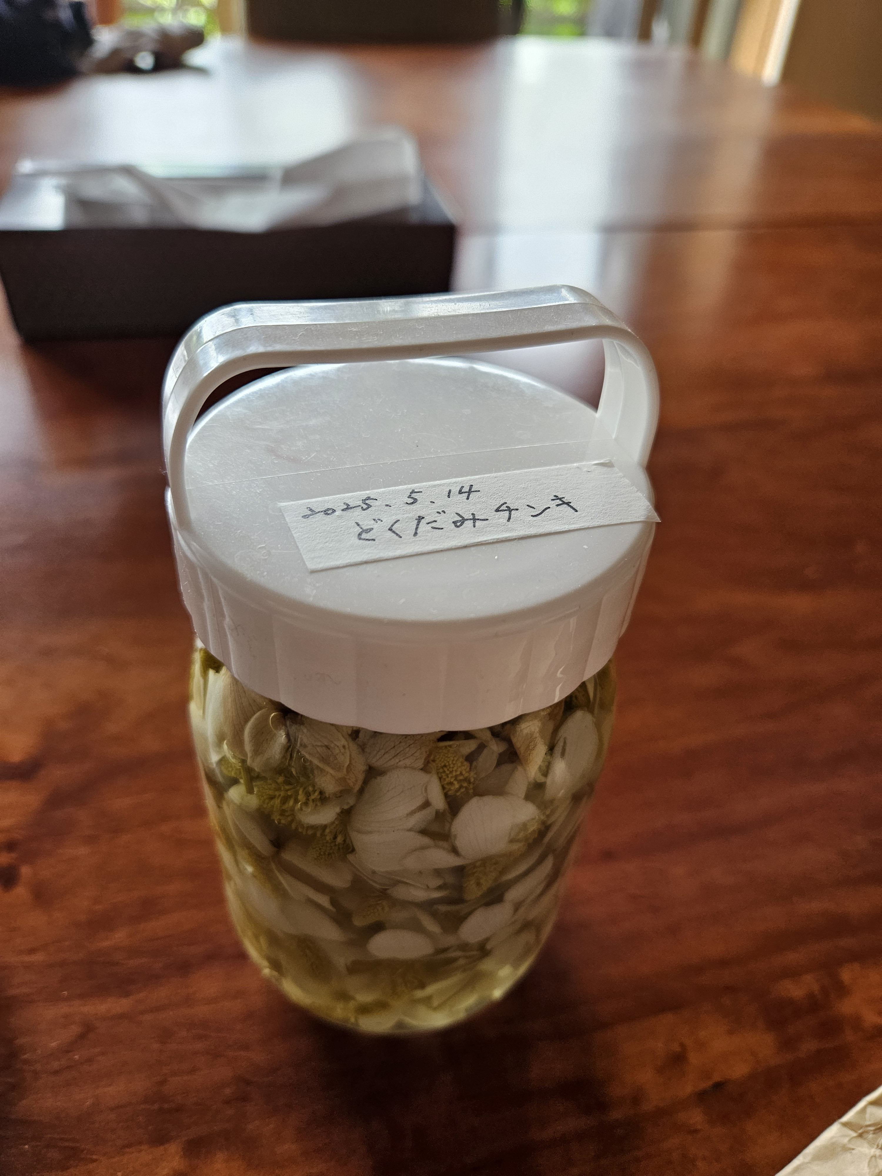 今日、一枚の畑を訪れ、お庭にドクダミの花がよく咲いていることに気づく。お宅にお邪魔すると、机の上に写真で共有してくださっていたチンキを準備してくださっていた。チンキづくりについてやり取りされていたことを思い出しながら、小倉さんお手製のチンキを塗らせてもらう。すると、幼い頃、火傷をした際に祖母が塗ってくれたムカデ油を思い出した。(みんなに話してみると知らない様子・・・あれ。)