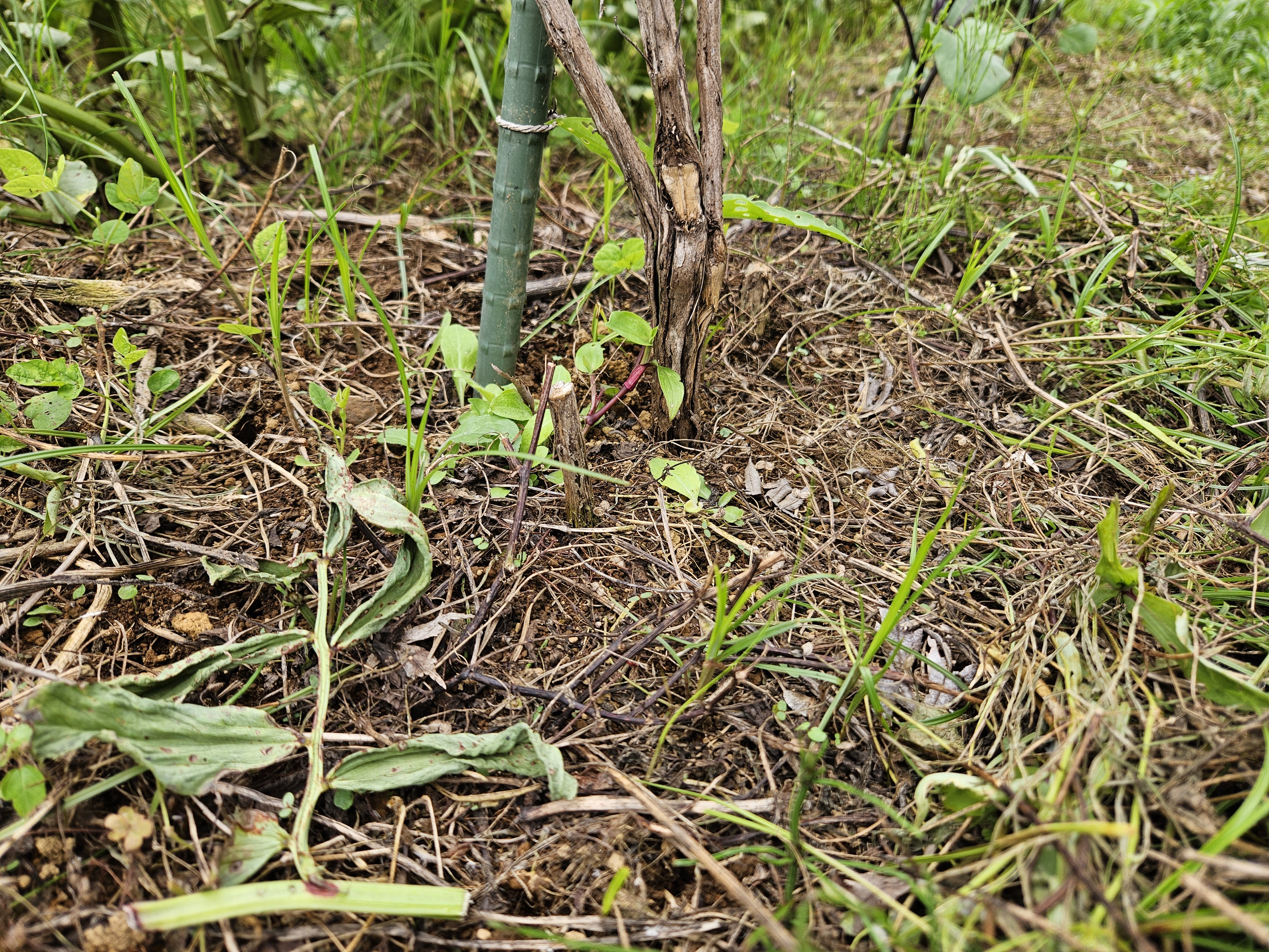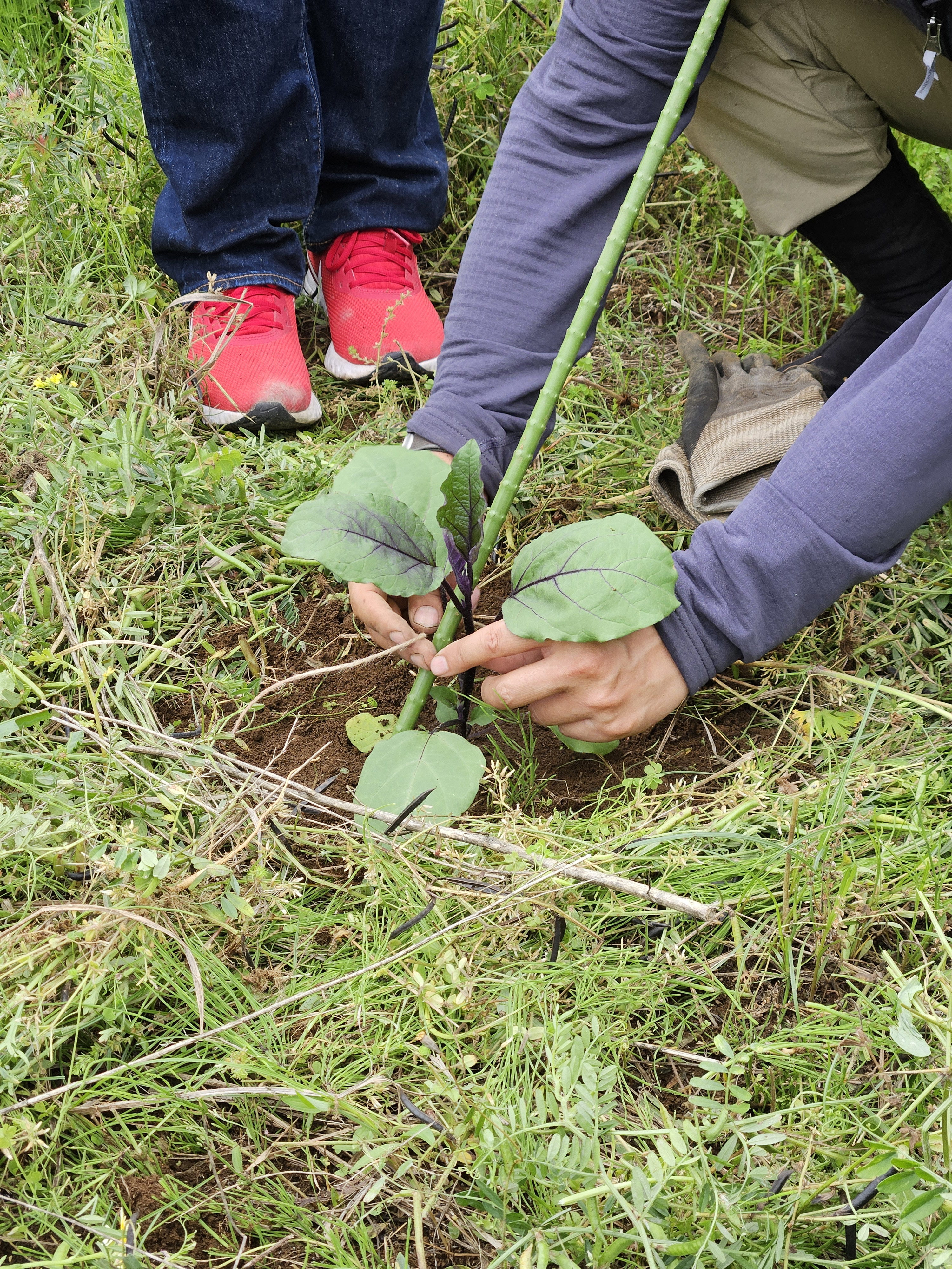 苗が倒れないように支柱に固定する。支柱は苗の根っこに当たらぬように、斜めに突き刺す。支柱と苗の接点を紐で結び留める。八の字に紐を通し、少したるみをもたせて。簡単に紐が解ける結び方を教えてもらった。由井さん曰く、「ほどけやすさ」が大事という。今後の仕事のなかで、何本も何回ほどいていくことになる。その時に堅結びにしてしまうと仕事が進まない。苗も傷つけてしまうかもしれない。。ここでも時間軸が見えてきた。当然、植えた先の仕事を見据えて今の仕事もある。