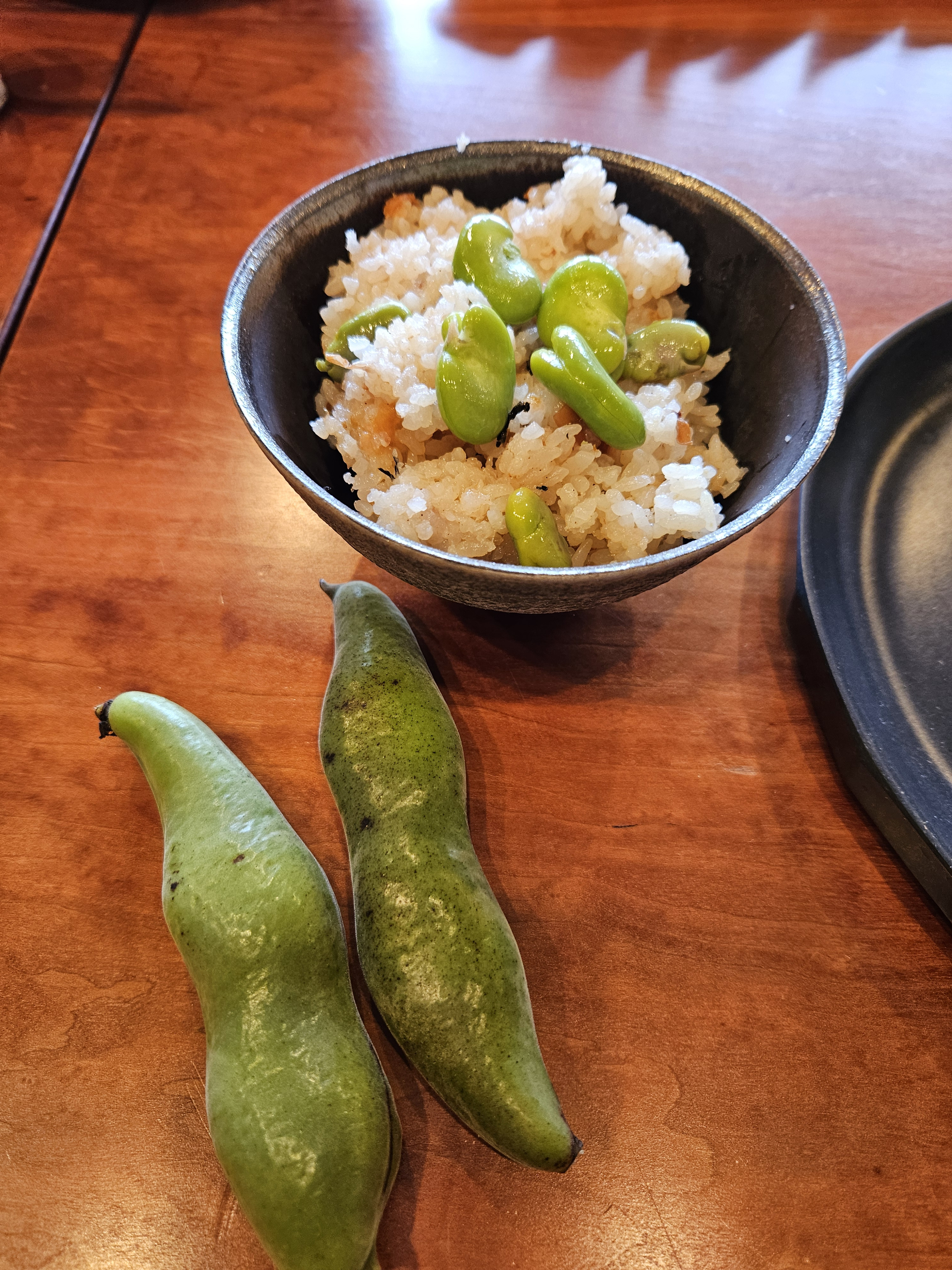 梅干し炊き込みご飯と蚕豆、きつねコロッケ、エンドウ豆と豆腐とえびあんかけ、きゅうりカブの浅漬け・・・本日も季節野菜のご馳走を沢山いただきました。美味しいお昼ご飯をありがとうございました。ごちそうさまでした!