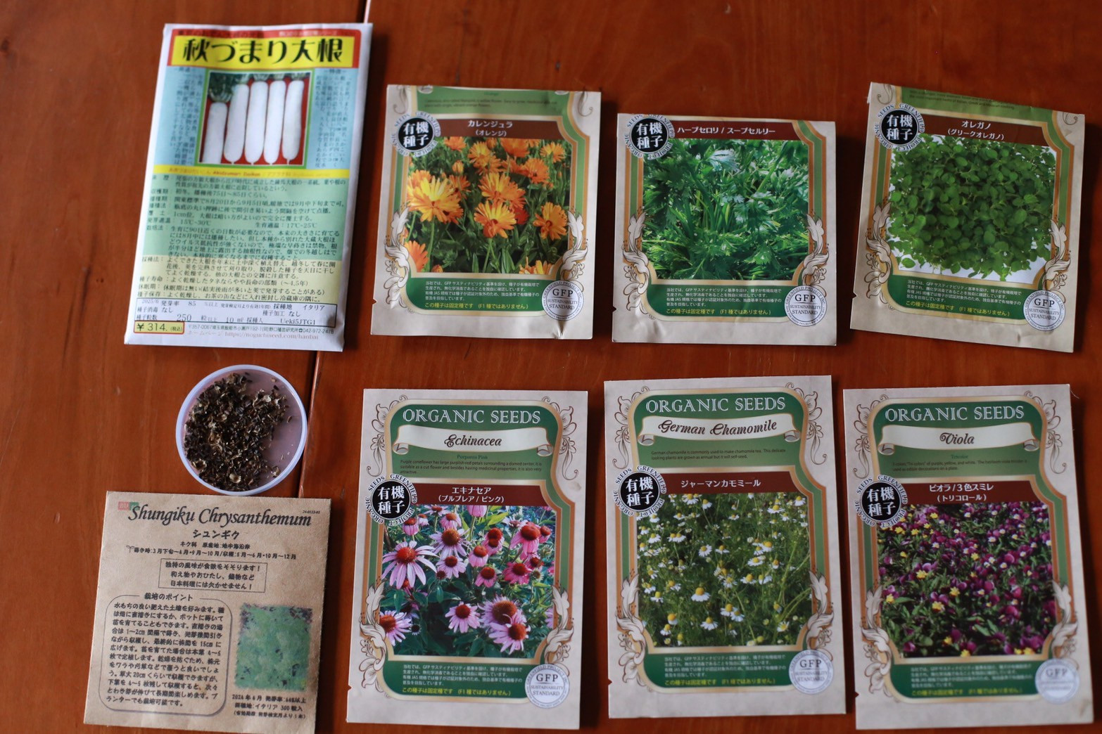 当日までに揃った種は、ビオラ、ジャーマンカモミール、エキナセア、カレンジュラ、ハーブセロリ、オレガノ、秋づまり大根、春菊である。春菊は春に自家採種したもので、ついに播種できることを感慨深く思う。