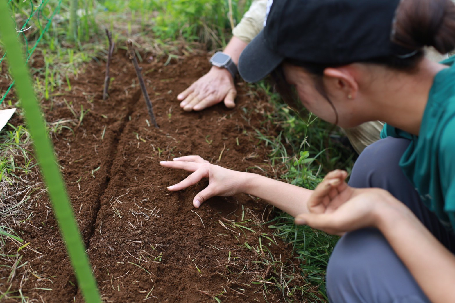 大根と春菊は直播きする。先月播種した人参はほとんど芽が出ていないか、芽が出ていても虫に食べられている。芋虫が好んで人参の葉をたべるという。厳しい戦いだが、こちらもめげてはいられないので、人参の畝に重ねるように大根を播種する。キク科の春菊は、虫を寄せにくいということでコンパニオンプランツ的な働きがあるかもしれないと、大根と春菊の種を混ぜて播種したり、一列ずつ交互に播いたりしてみる。実験、実験。来月のレポートで結果発表したい。最後は萱を薄く敷いて、暑くなりすぎないようにした。