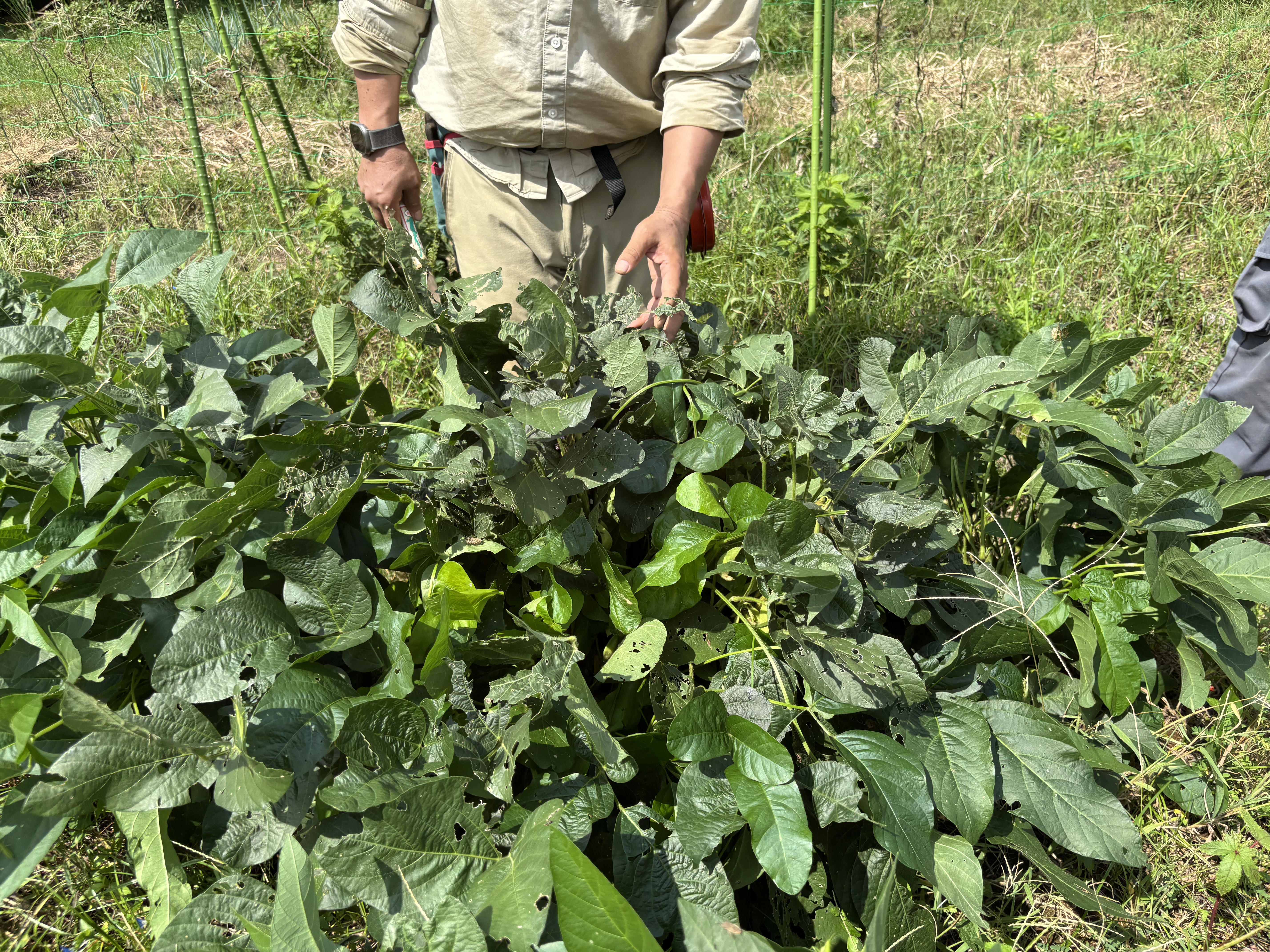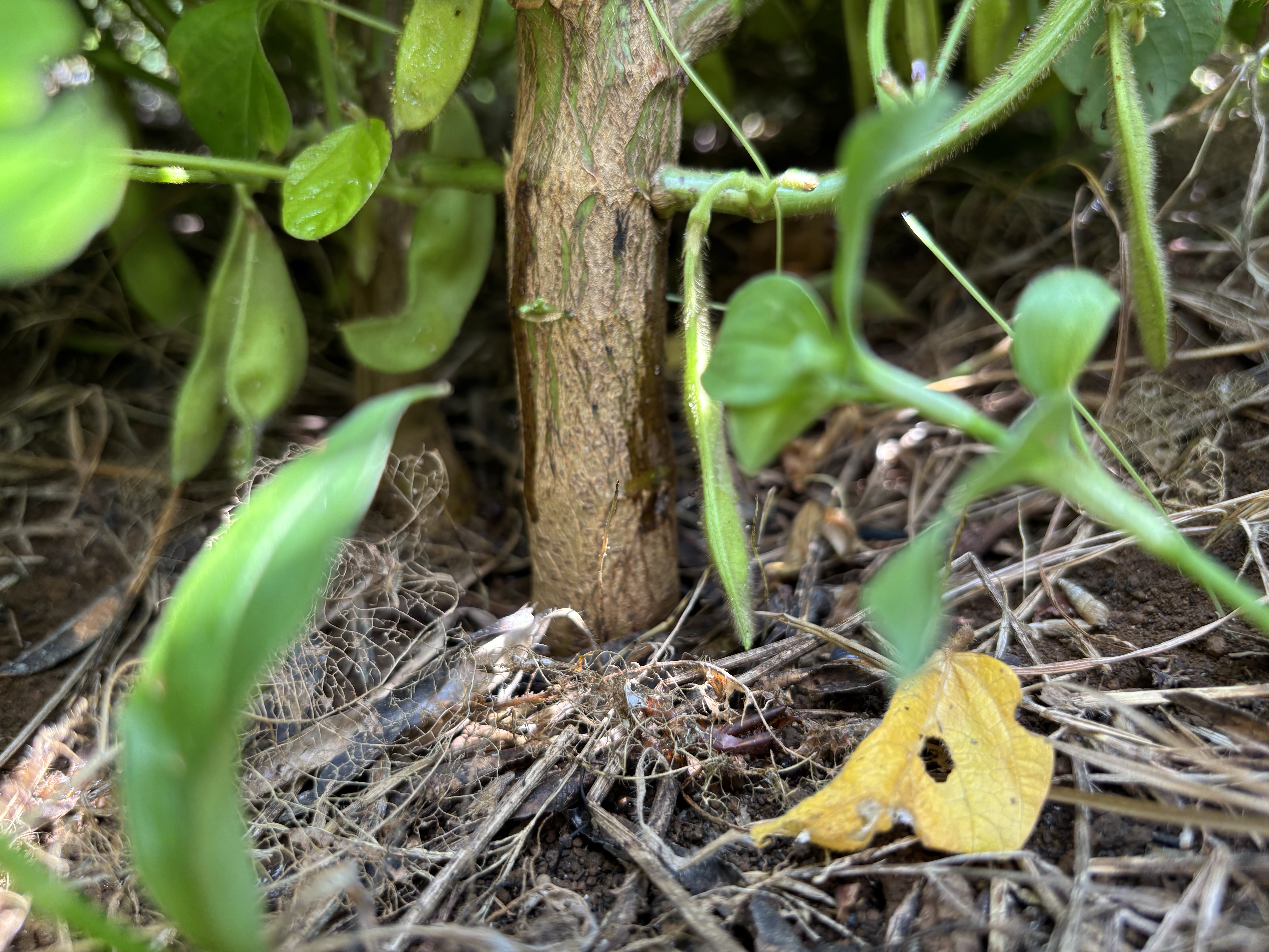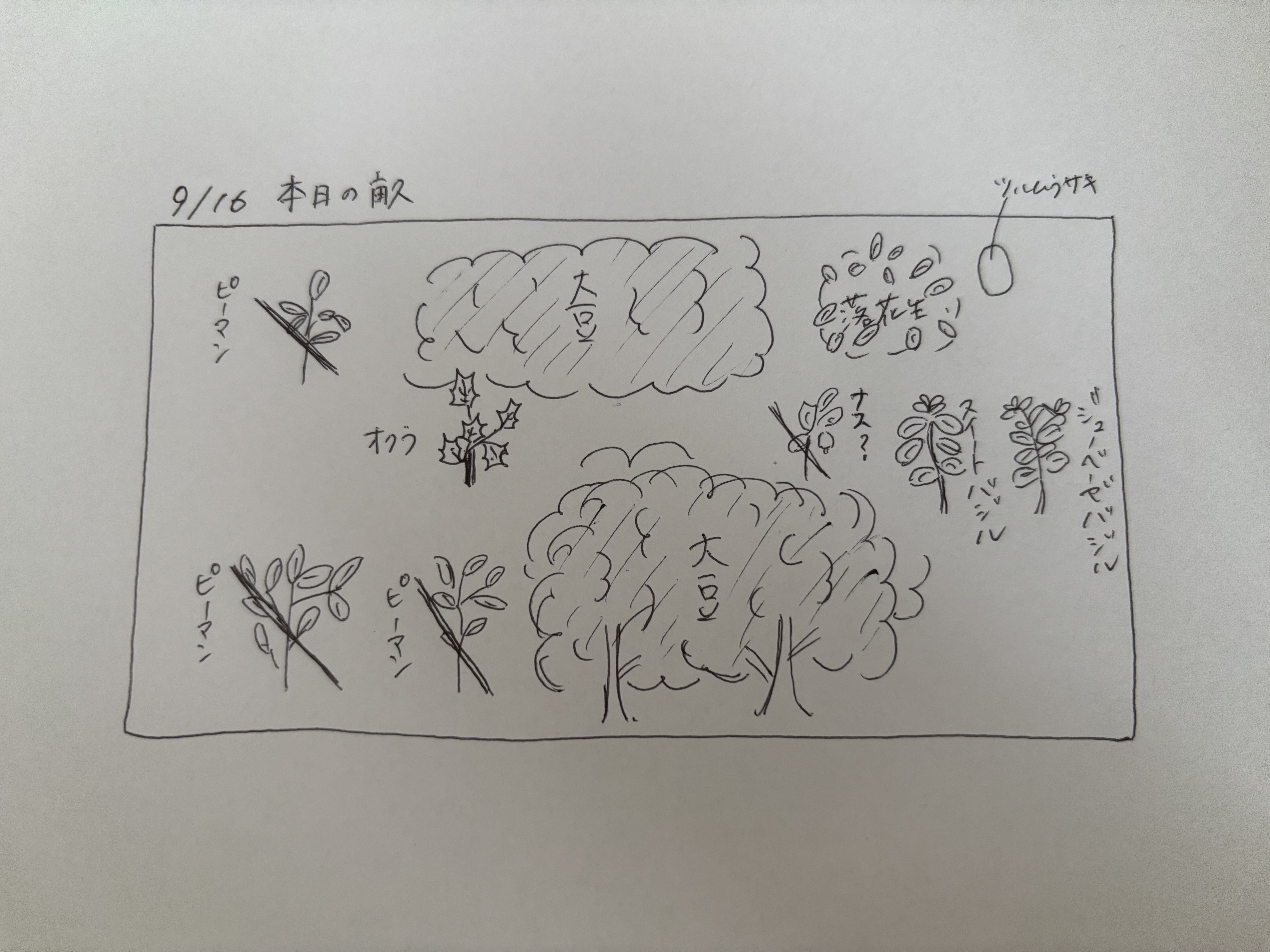 ひときわ森のように茂って見えるのは、大豆だった。木のように太い茎でその体を支え、こんもりと青々しく成長している。茂みをかき分けると房がなっていた。これが枝豆だ。ひょろひょろと芽がでた6月からここまで大きく育つとは想像していなかったので嬉しく思う反面、これだけ大豆に栄養を使っているということは、他の作物になんらかの影響があるのではないかと心配にもなる。大きく育つということは、その分養分を使っているのであって、バランスは悪いかもしれない。そう思ったのは、大豆の茂みに隠れているオクラが全く成長しないこと、3株あるピーマンがどれも葉が黄色く元気がないこと、つるむらさきも枯れてしまったことからだ。人間の生活も「バランスよく」が一番難しいのと同じように、畑も意識せずとも偏りが生じてしまう。人間が畑にできることは限られているけれど、バランスを考えられる畝を作れるようになりたい。