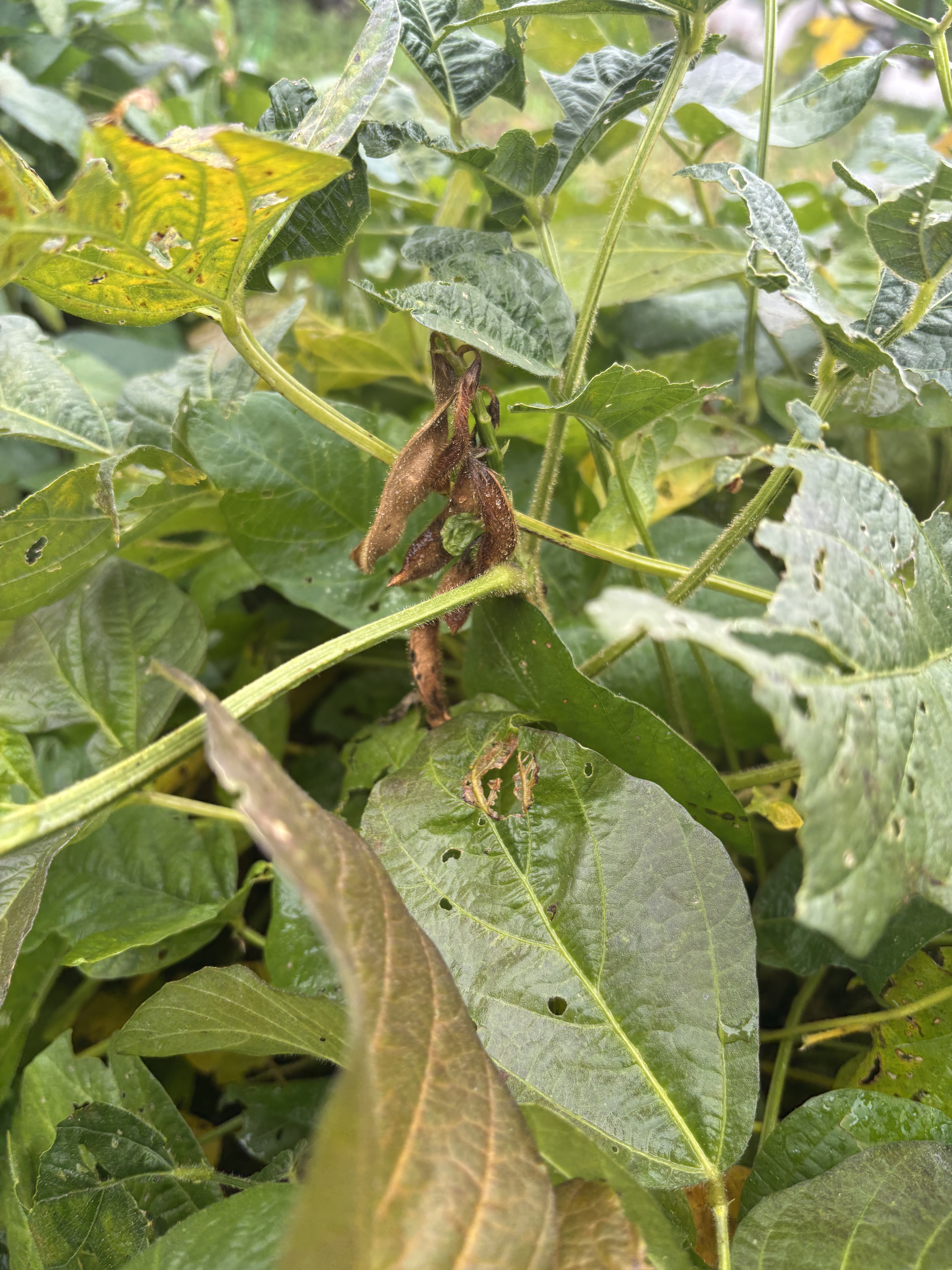 どちらも同じくらいの大きさに育ち(高さ50cmほど)房ができ、豆が入っている。だが房を見ると5月播きのほうはいくつか茶色く変色し枯れた房がある。豆が入っていない房も見受けられる。葉は黄色くなり、虫食いの面積が大きい。