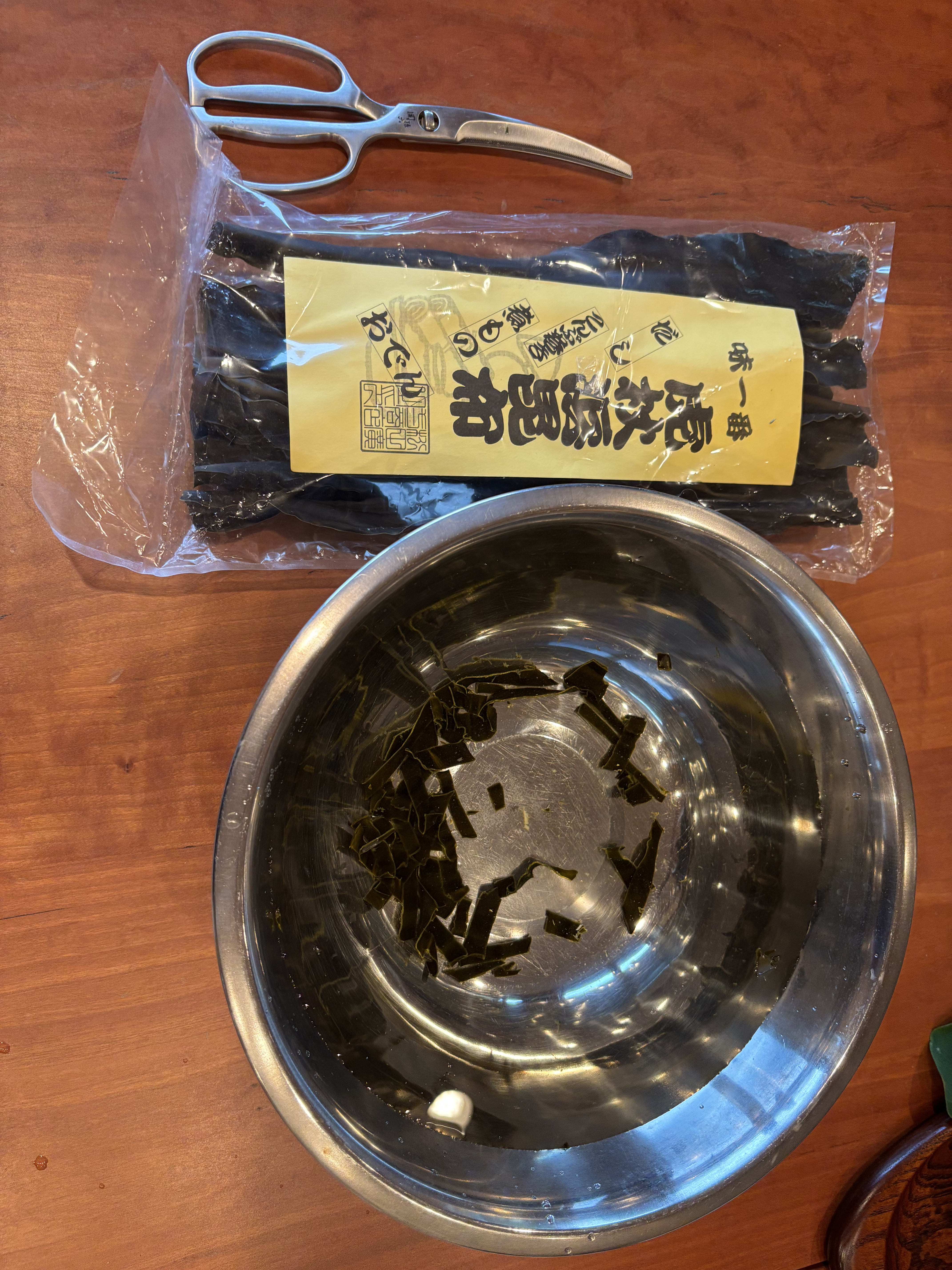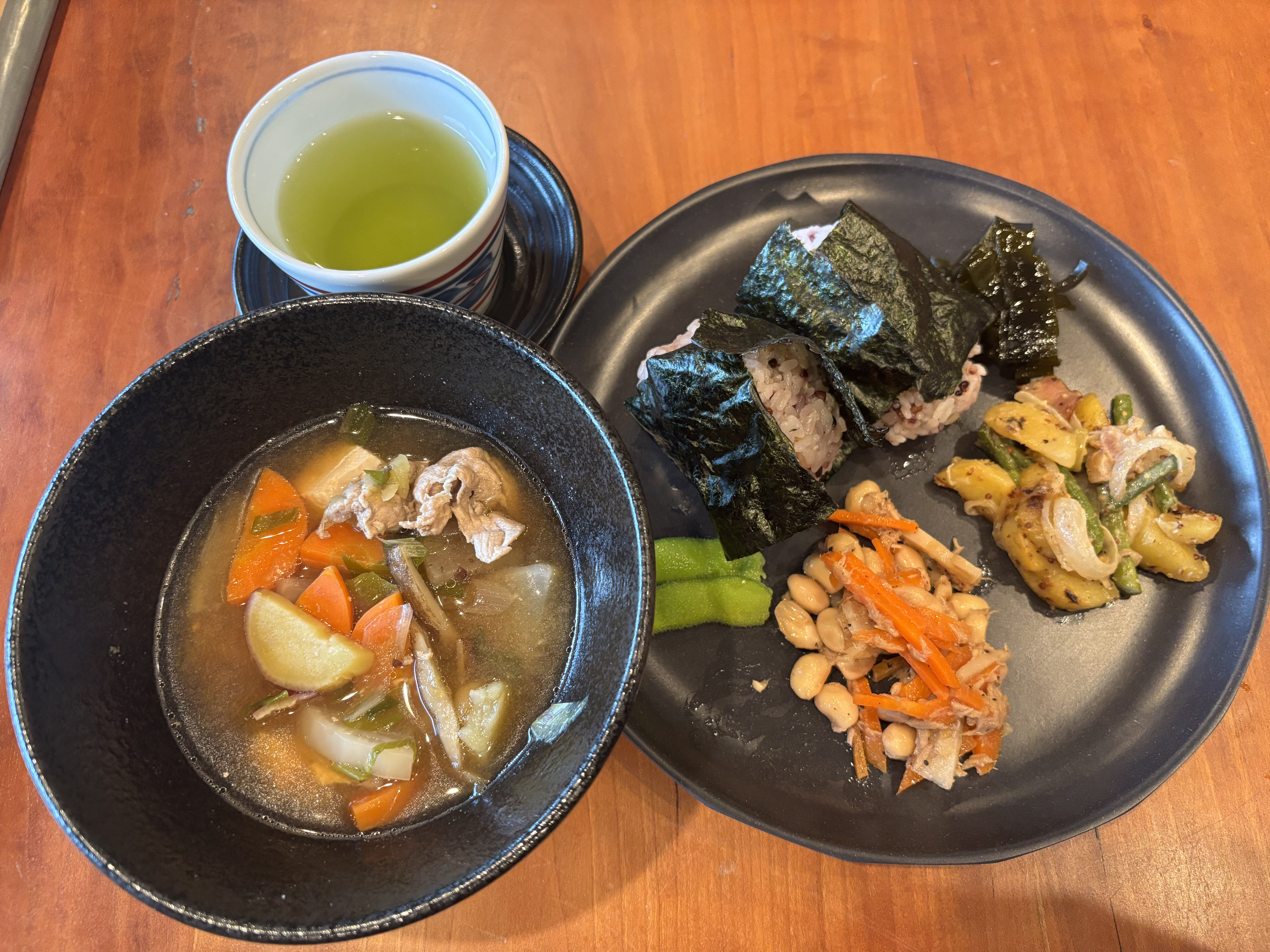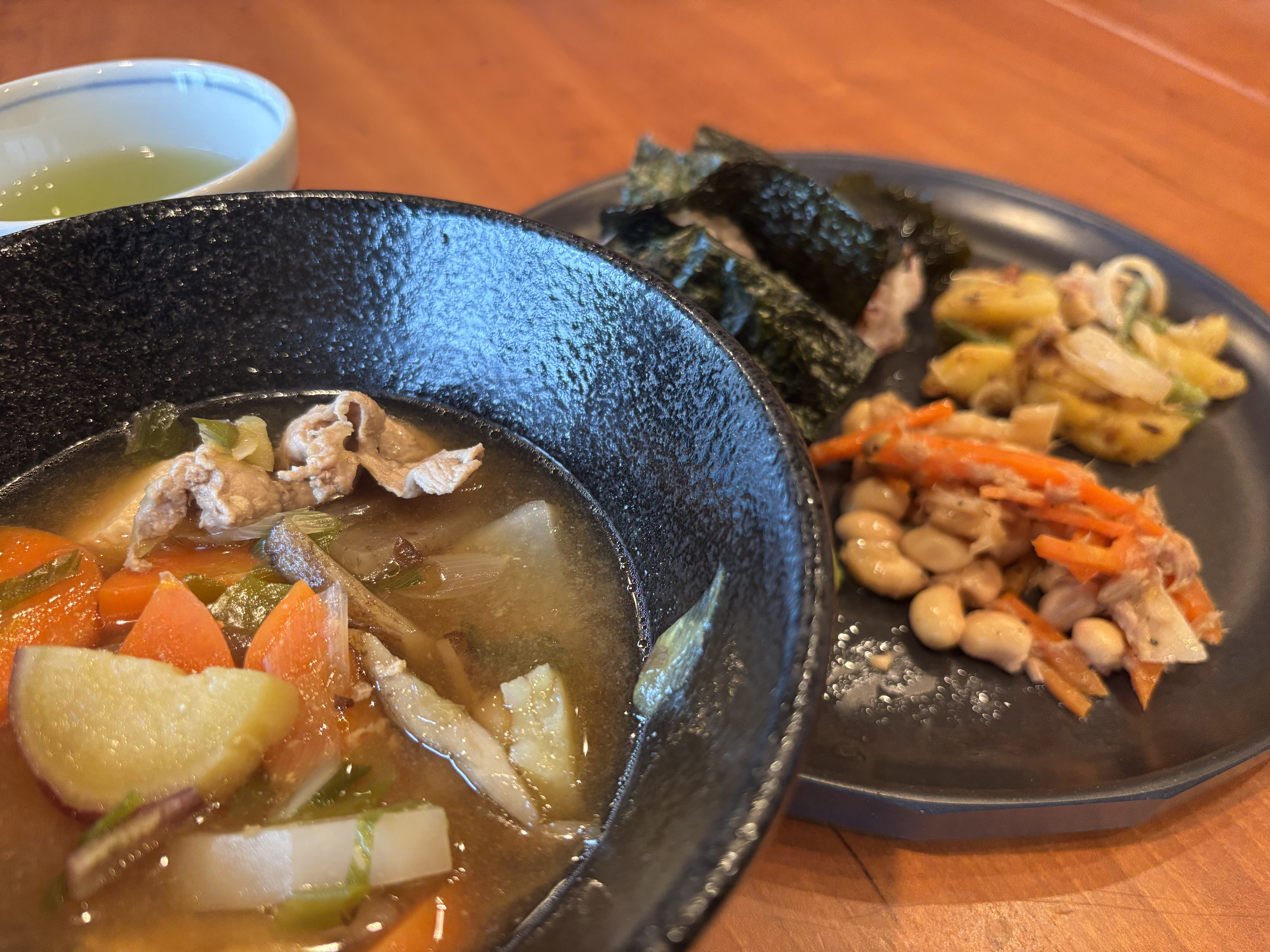 さて、雨が強くなってきたので室内へ。今日の「汁講」は私が担当した。豚汁をつくる。私はおにぎりと豚汁のセットが一番の好物だ。寒い日に外で食べる豚汁が冬の思い出として強く残っている。特に2日目の豚汁が好きで、家でも好んで豚汁を作ってもらっていたことを思い出した。これまで作ってもらったものを今回は私が振る舞うことになる。今年の冬に初めて仕込んだ黒豆と大豆の味噌がちょうど完成したこともあって、その味噌で味を決めた。北海道の虎杖浜昆布を使って、小倉さんに出汁の取り方を教えていただく。昆布の断面がなるべく大きくなるようにしてはさみで切り、水につけておく。それを沸騰直前まで鍋で火にかければ昆布出汁が取れる。出汁を取り終えた昆布は佃煮に、鰹節はおかかになって、今日のおにぎりの具になる。豚汁にいれる大根を切る際に出た皮はきんぴらになり、まるっといただく食卓が完成した。寒くなった一日だったが、汁が「場」も「心」も満たしていった。