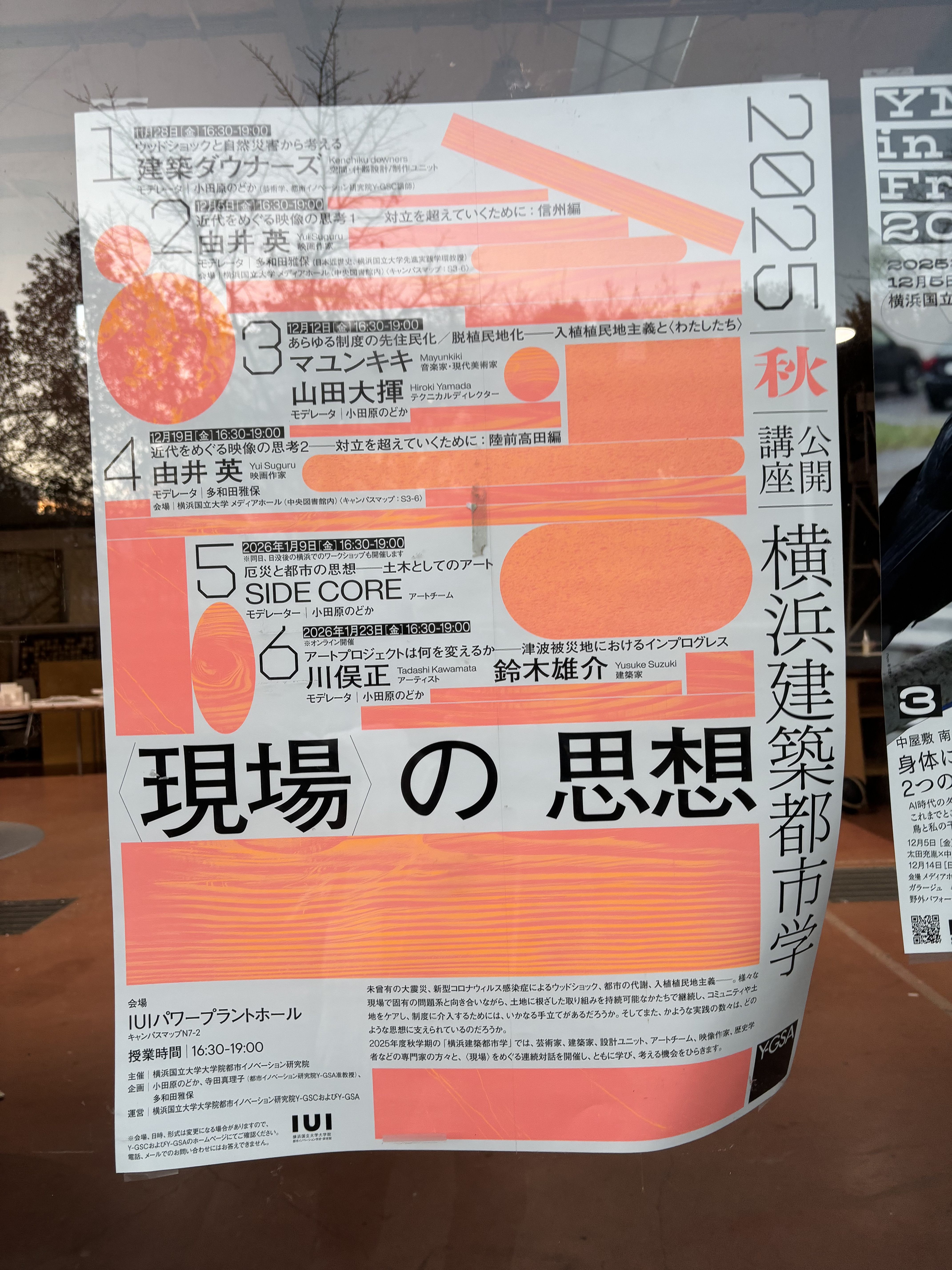 12月19日、横国大で開講されている公開講座、横浜建築都市学「現場の思想」の授業が開講されました。由井さんと私は2週間前と同じように国道1号線沿いを歩きながら、どんぐりの森を抱える横浜国大の会場に向かいます。(初回の授業はひとつ前の投稿をご参照ください。)