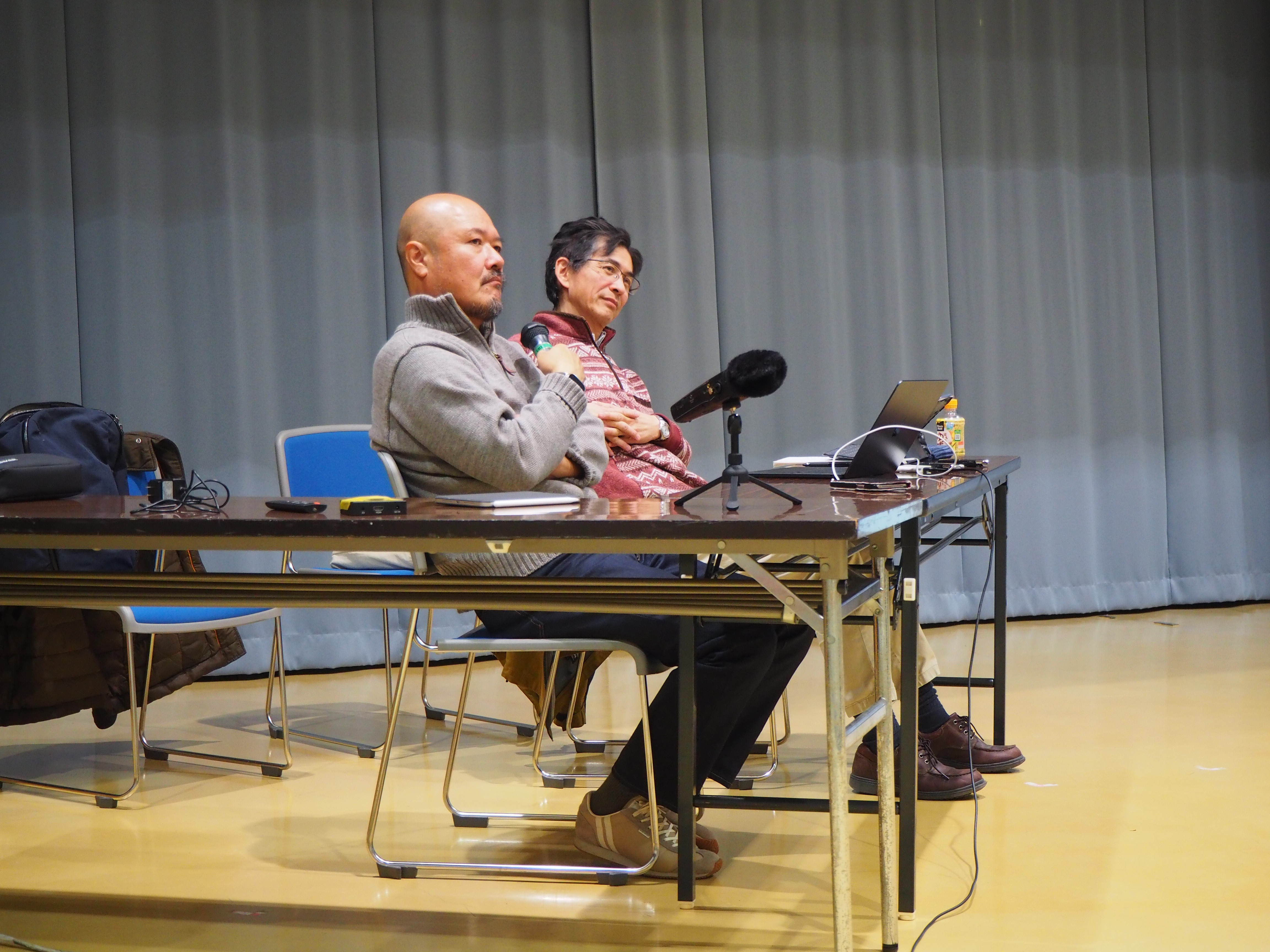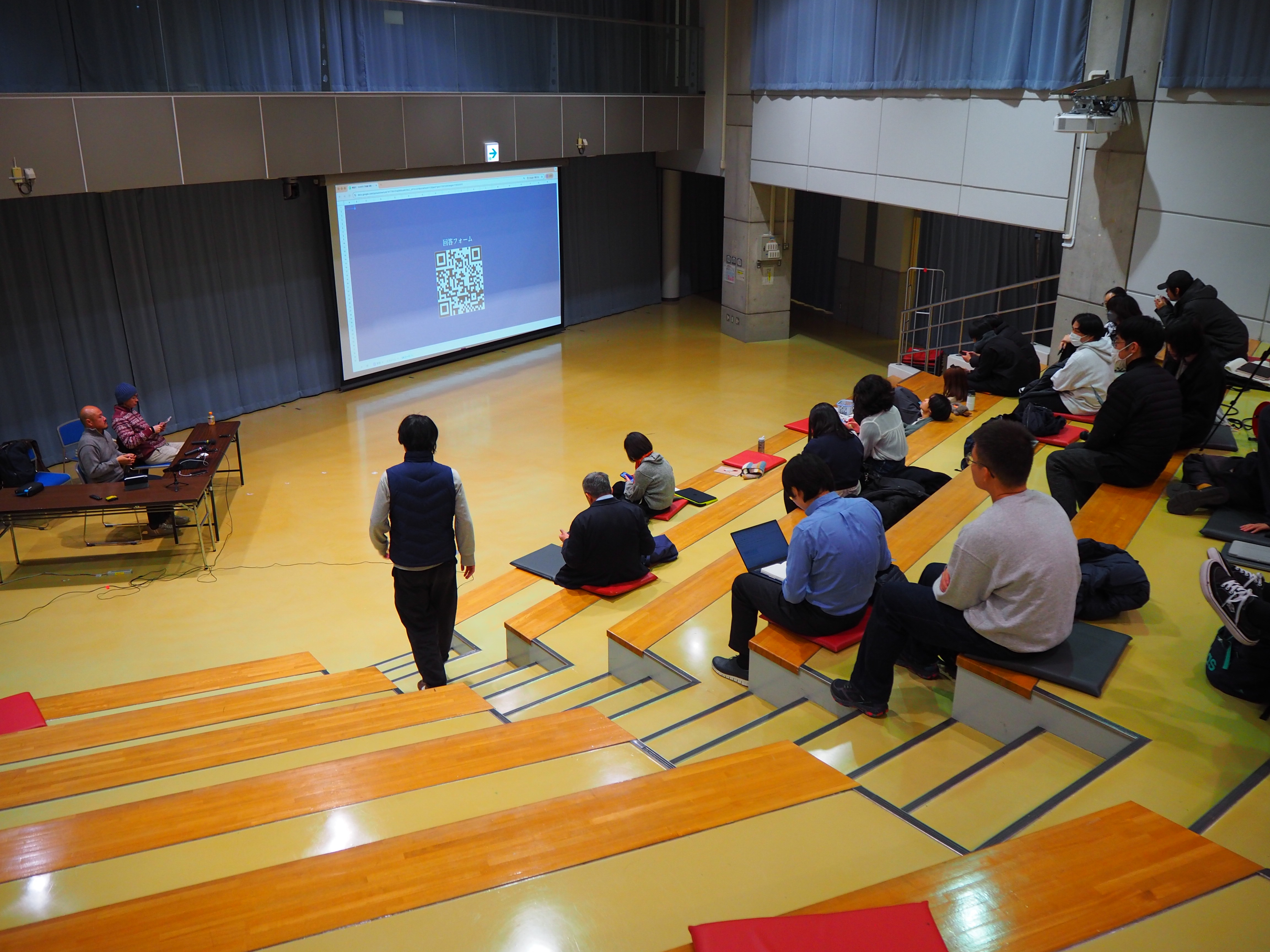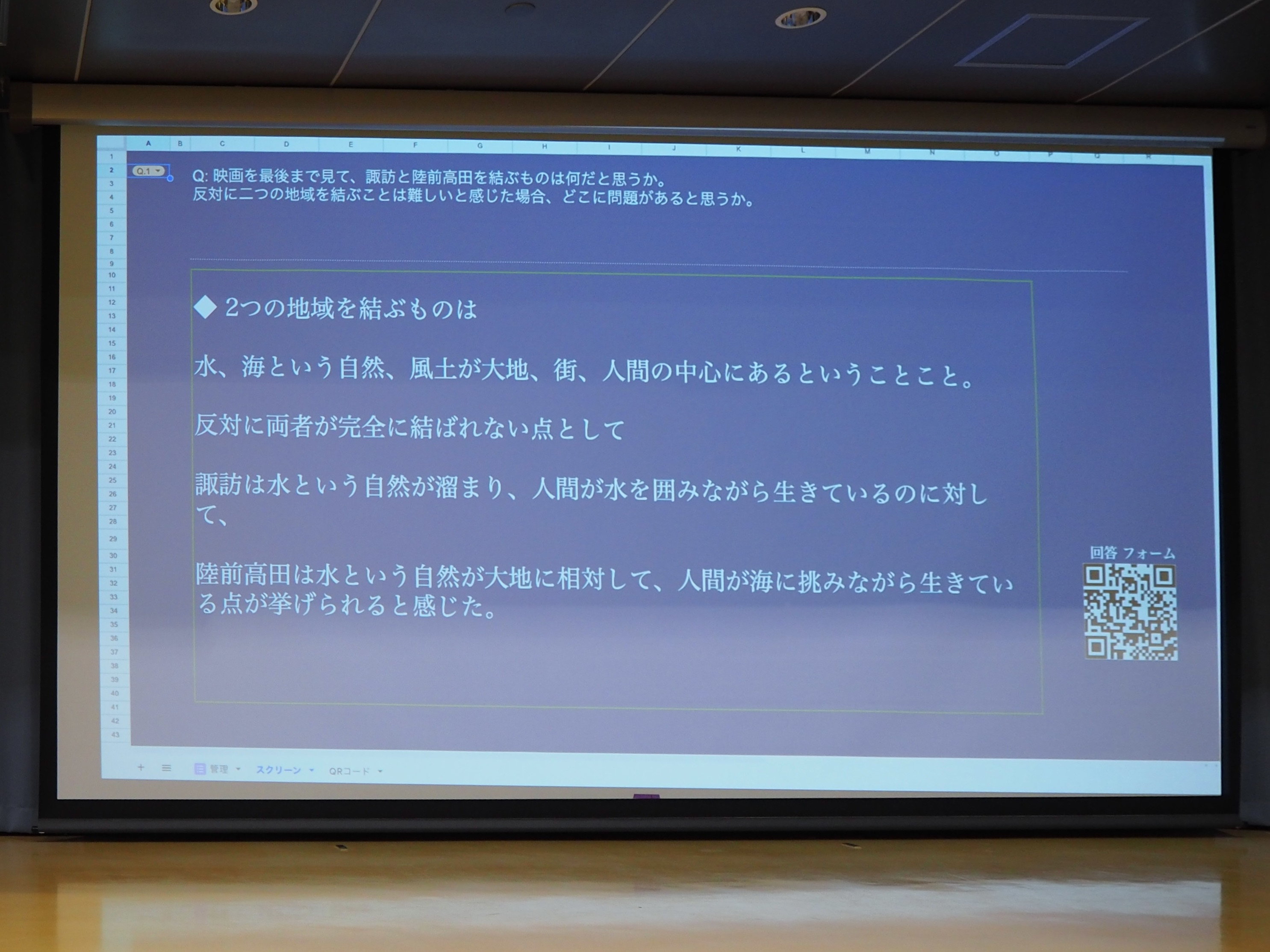 映画上映後は由井さんから受講生に出されたお題に回答するところからスタートしました。やり方は現代的で、スクリーンに映し出されたQRコードを読み取って、スマートフォンから回答します。その間に由井さんとモデレータの多和田さん(横国大・教育学部教授)のトークで対話への入り口を整えていくのです。