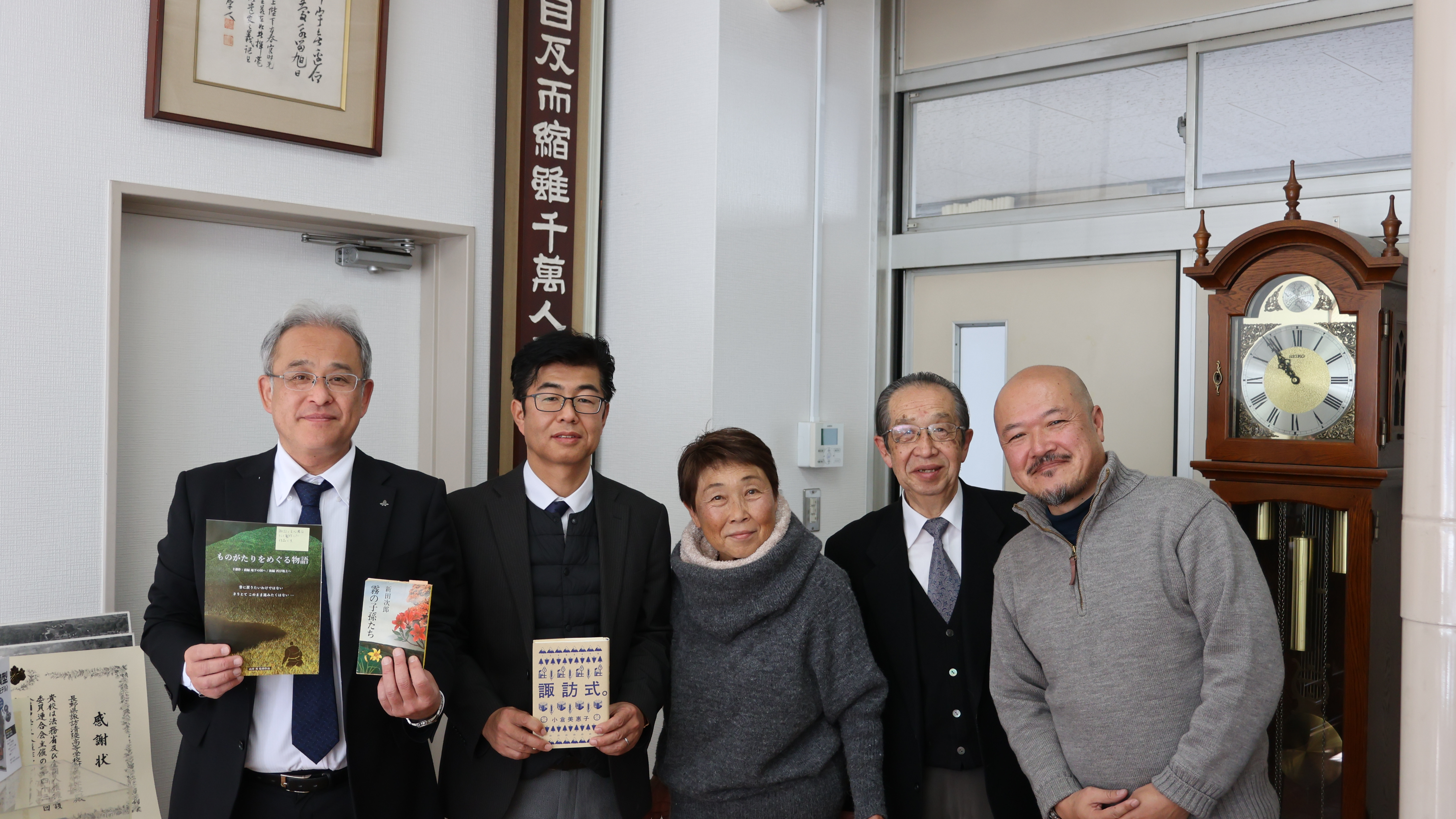 倉澤克弥(校長先生)、宮沢和紀(副校長先生)、小倉美惠子(「諏訪式。」著者)、熊澤祥吉(ライフプラザマリオ代表)、由井英(映画作家)